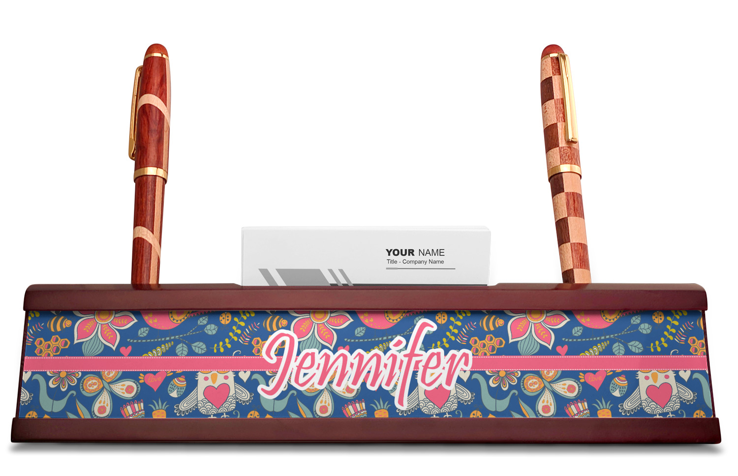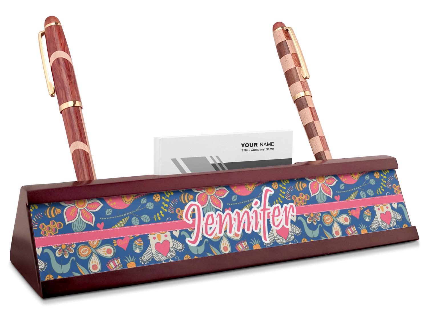 Your desk name plates are crafted from a high-quality, dark-cherry mahogany. At approximately 9.5 by 1.875 by 2.5 inches, this name plaque will fit perfectly, front and center, on your desk. Your customization spans across the entire face of the nameplate. Behind the nameplate lies a skinny slot that can fit approximately 15, traditionally-sized, business cards. You can also store your writing utensils on either side of this custom desk name plate.