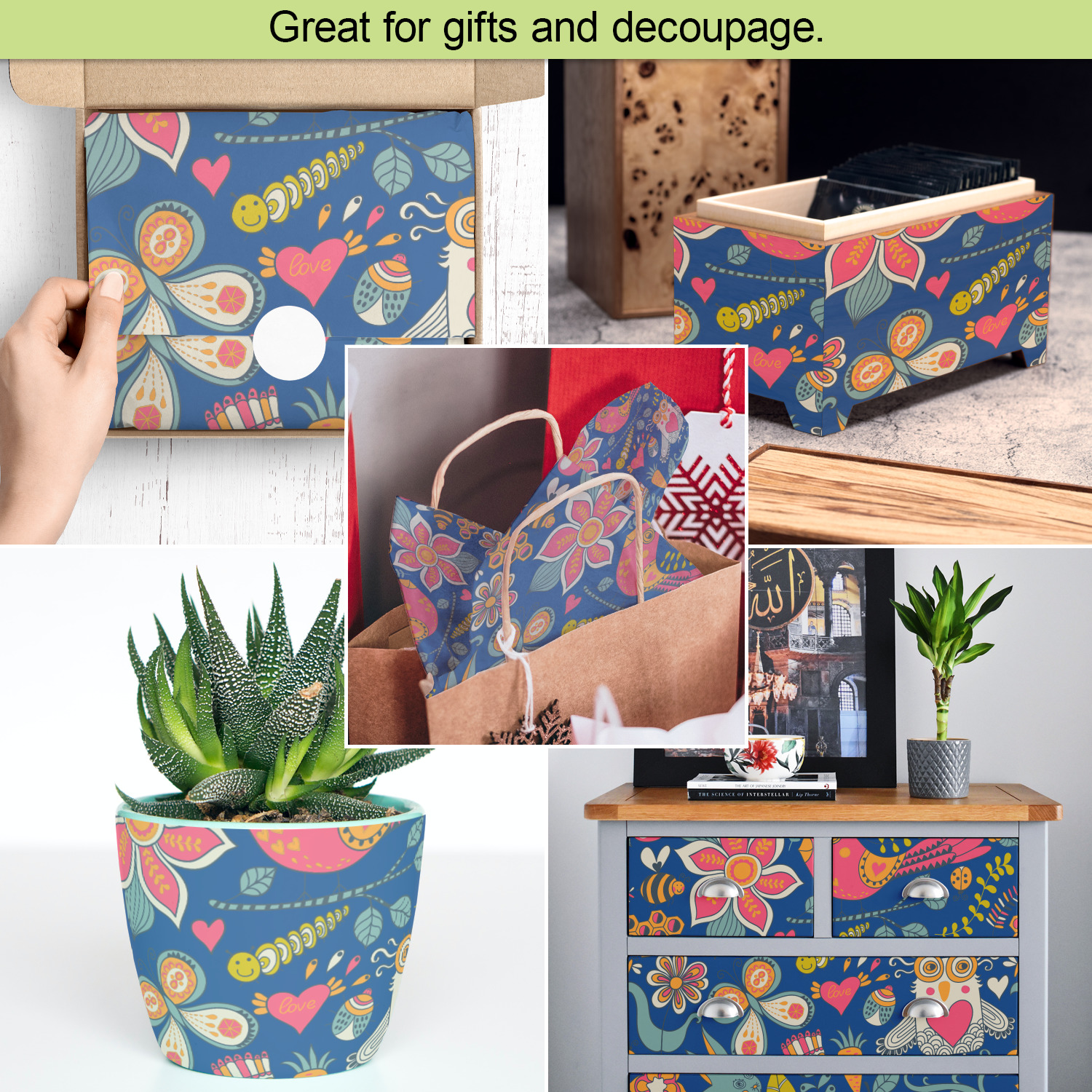 Our tissue paper sheets are also perfect for decoupage i.e. the art of gluing paper on ordinary objects to decorate them.
