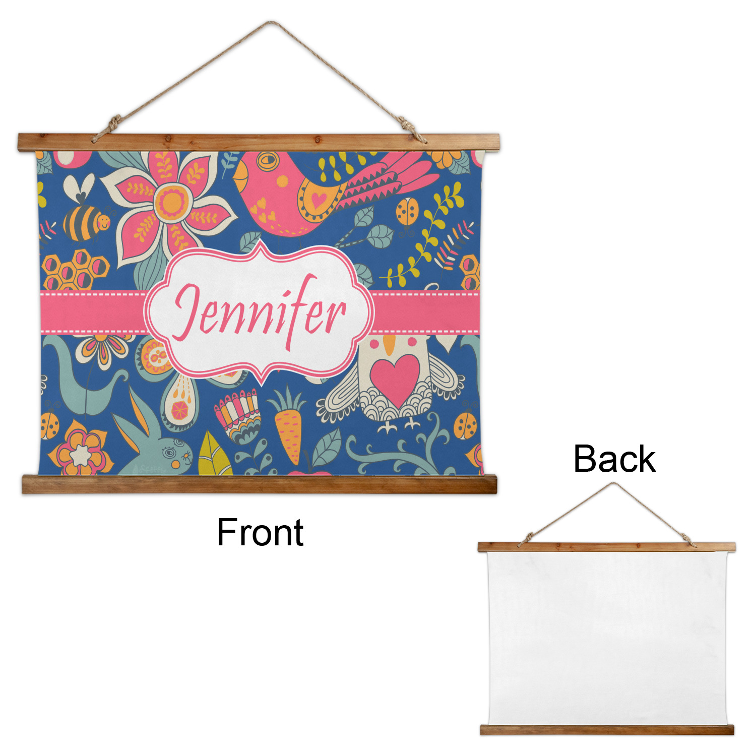 Made in two different orientations - portrait or landscape - both are 26" x 36". Your design is printed on a high quality polyester fabric with hemmed edges. The wood on the top and bottom of the tapestry is 1.25" tall and 0.25" thick and there are two pieces on top and bottom which sandwich the fabric.