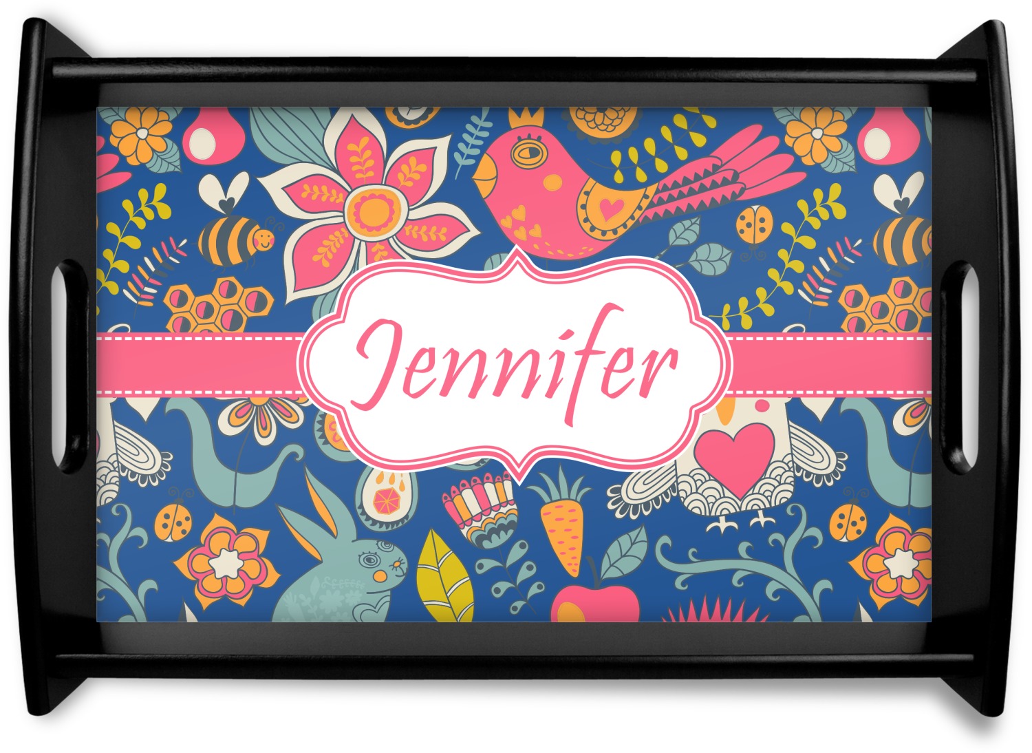 This serving tray with handles features square edges and two rounded sides, creating a very modern look. Each side is fabricated from a beautifully cut, natural wood. The bottom of the interior of the tray displays your customized design in bright, vibrant color. The tray is sold in both a black color and a natural wood look. Each variation of the wood serving tray has two sizes: Small, which is 14" x 10" x 2.25", and Large, which is 19.5" x 13.5" x 2.75".