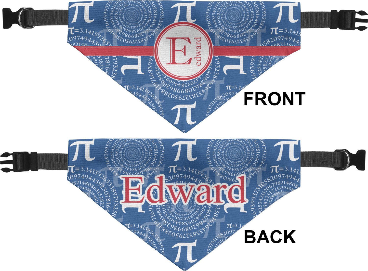 We print the front and back of these dog bandanas with your customized design. The bandana itself is made from a durable polyester, sewn together with a gap large enough to accommodate any collar. Regardless, the bandana includes a plain black, canvas collar with plastic snaps, that can easily be removed if desired. These dog bandana collars are available in four sizes: small, medium, large, and extra large. Please see our sizing chart for more information regarding the dimensions of each size.