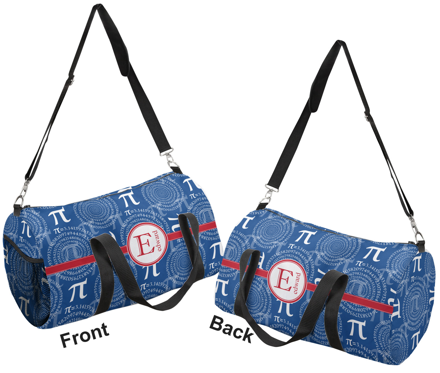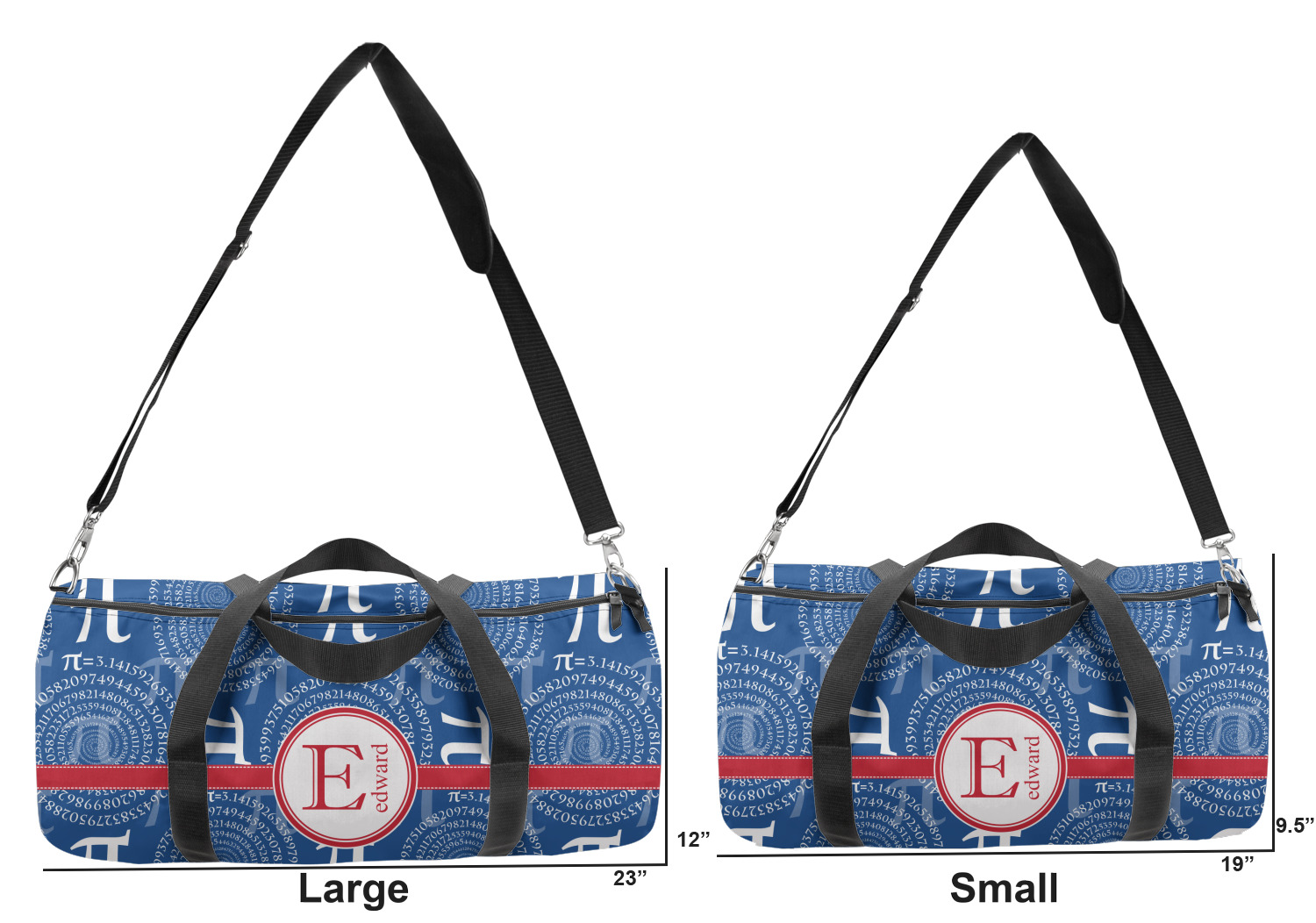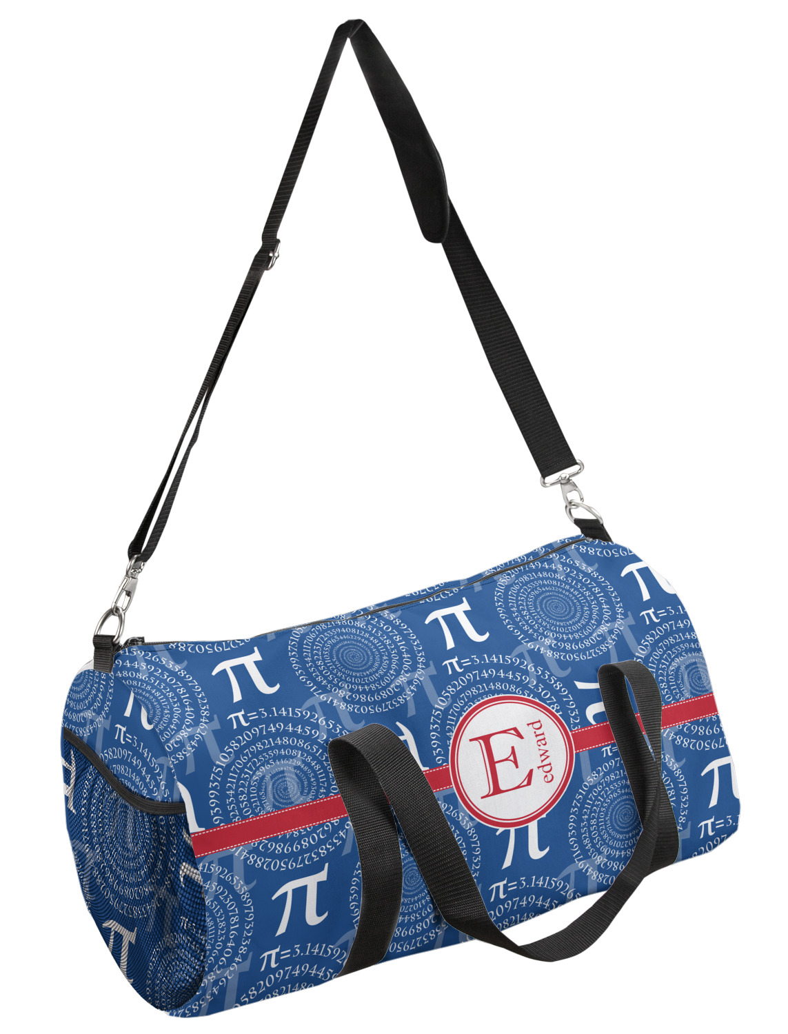 This duffle is a sturdy bag made of a canvas material. It comes in two sizes: Small (19"W x 9.5"H x 9.5"D) and Large (23"W x 12"H x 12"D). The bag is a cylindrical shape with a black adjustable strap and two handles. On one side is an elastic pouch to put a waterbottle or other small item. Your product will be sublimated with your design and is able to be designed on the front, back, and sides. Be sure to remember that the straps may cut into parts of your design if you upload your own artwork.