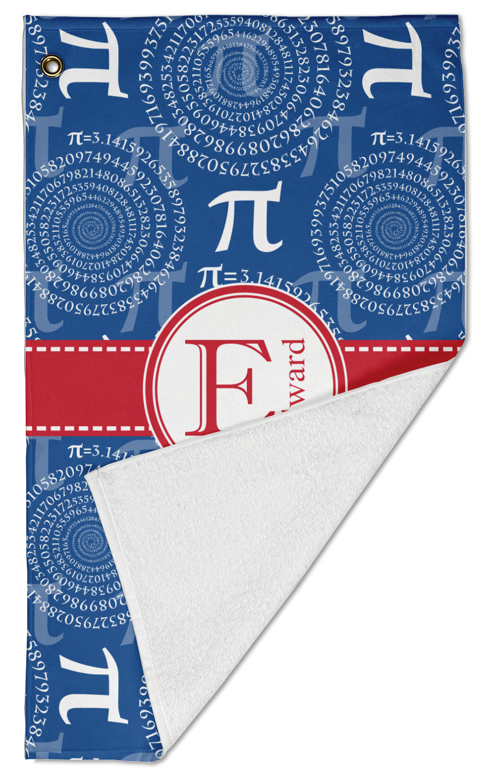 The towel is fully printed / patterned on the front polyester side; and is white on terrycloth cotton backside. The towel has grommet and a pear spring clip in the top left corner. Our golf towels are available in 100s of different prints and patterns.