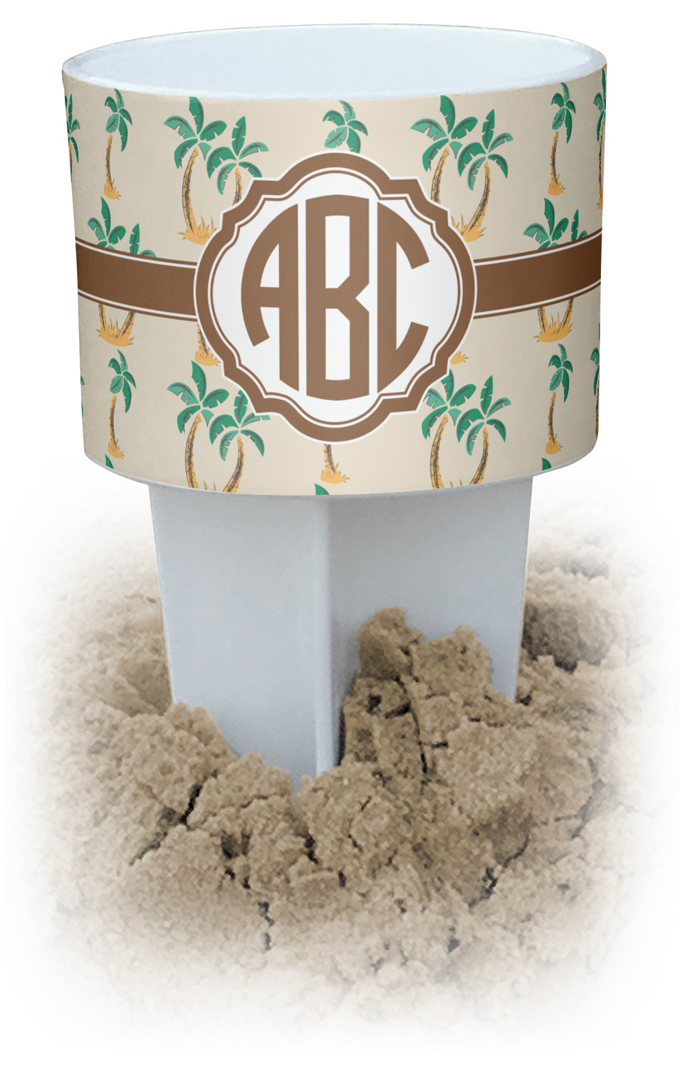 This cup holder has a large stake at its bottom that anchors it to the sand or ground below, while the cup holder rests above the stake. The entire drink holder is made of durable plastic and displays your customization around the cup holder portion. We sell these personalized beach spikers in two different colors: black and white.