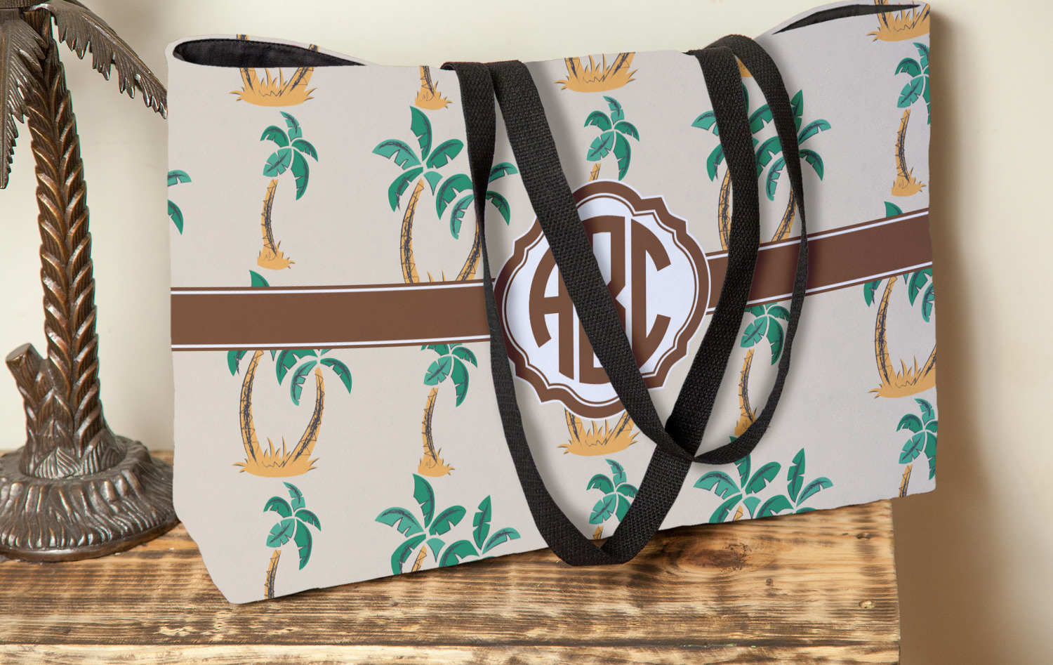 The totes are made from a sturdy canvas material on the outside and are lined with a black poly cotton lining. The beach totes have an approx. 28" black woven handles.