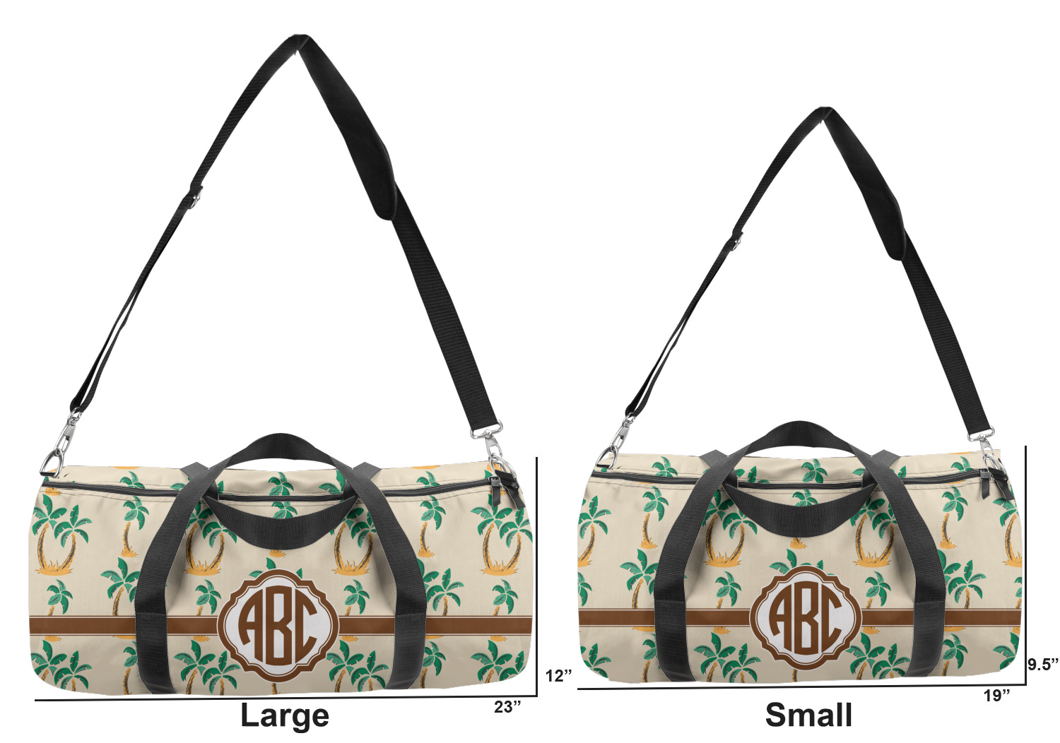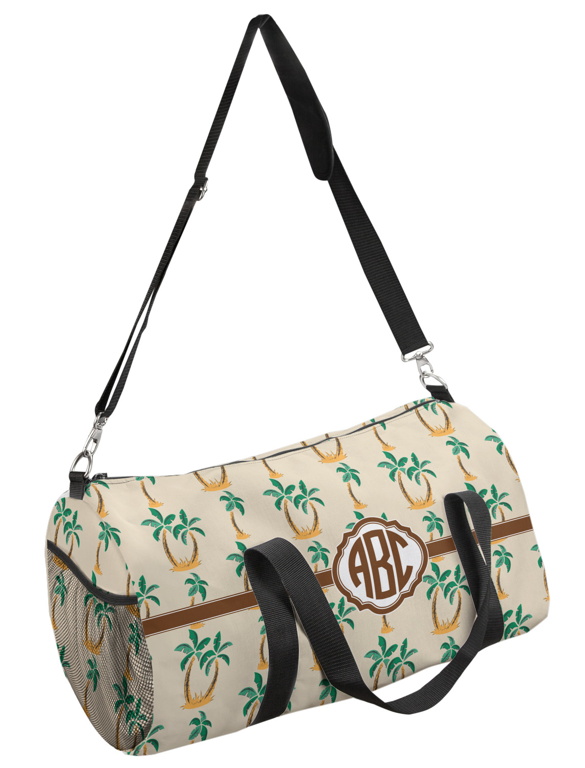 This duffle is a sturdy bag made of a canvas material. It comes in two sizes: Small (19"W x 9.5"H x 9.5"D) and Large (23"W x 12"H x 12"D). The bag is a cylindrical shape with a black adjustable strap and two handles. On one side is an elastic pouch to put a waterbottle or other small item. Your product will be sublimated with your design and is able to be designed on the front, back, and sides. Be sure to remember that the straps may cut into parts of your design if you upload your own artwork.