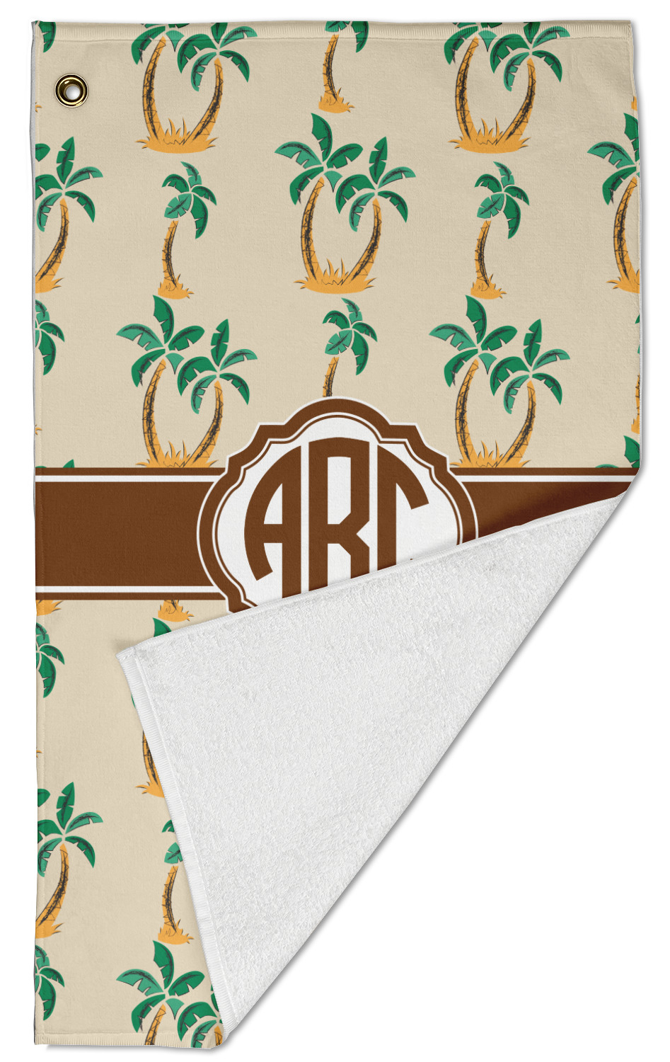 The towel is fully printed / patterned on the front polyester side; and is white on terrycloth cotton backside. The towel has grommet and a pear spring clip in the top left corner. Our golf towels are available in 100s of different prints and patterns.