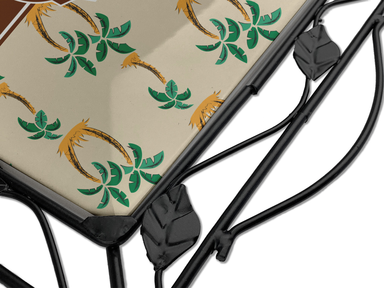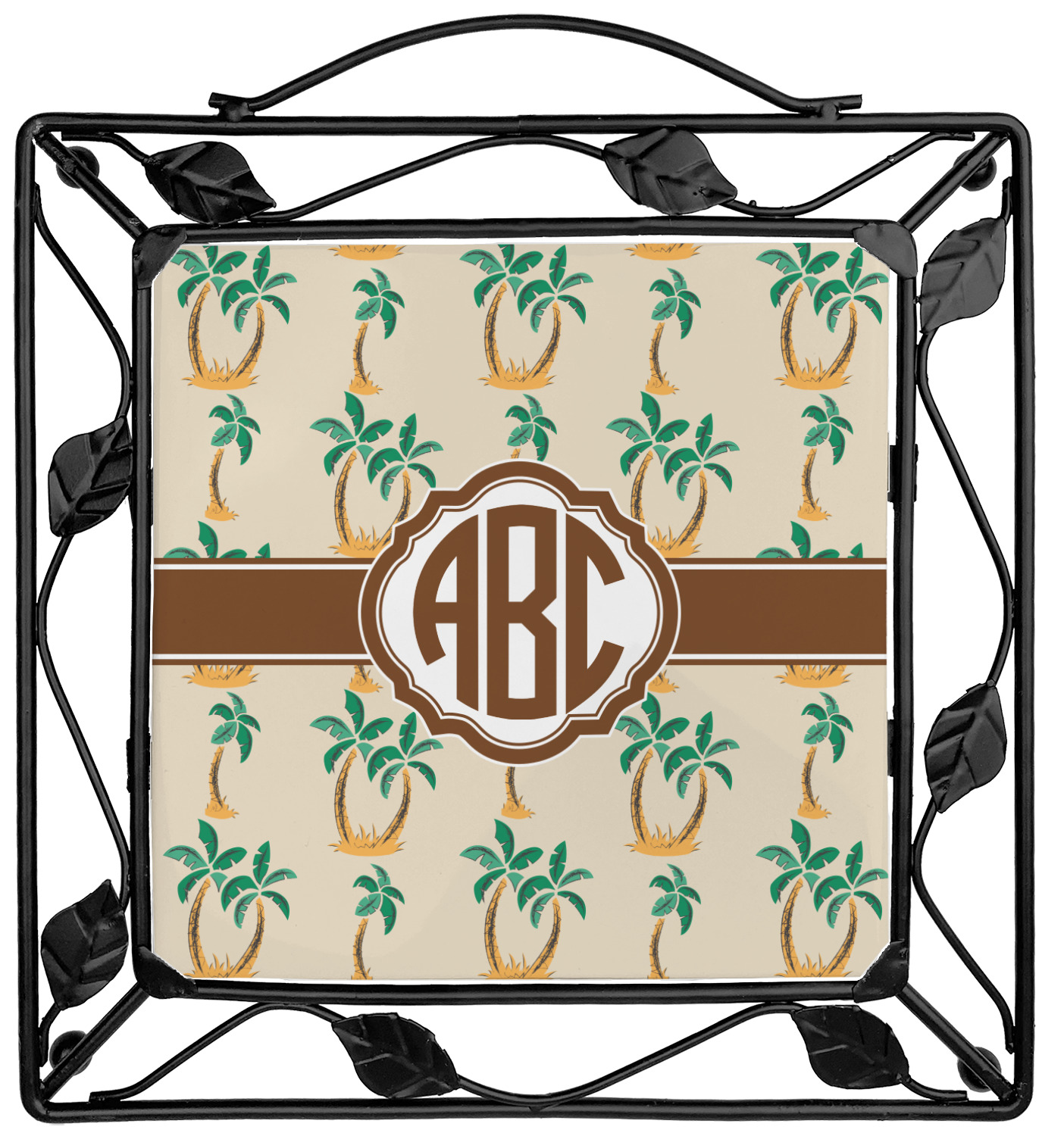 Our square trivets are made from a durable, wrought iron. This model features 4 small half circles, one on each corner, and a larger ring of iron that circles the central, customized tile. Each of the 4 corners has a round foot on its bottom for stability. This trivet is 8.75 by 8.75 inches, but the central tile measures at 6 inches on both sides.