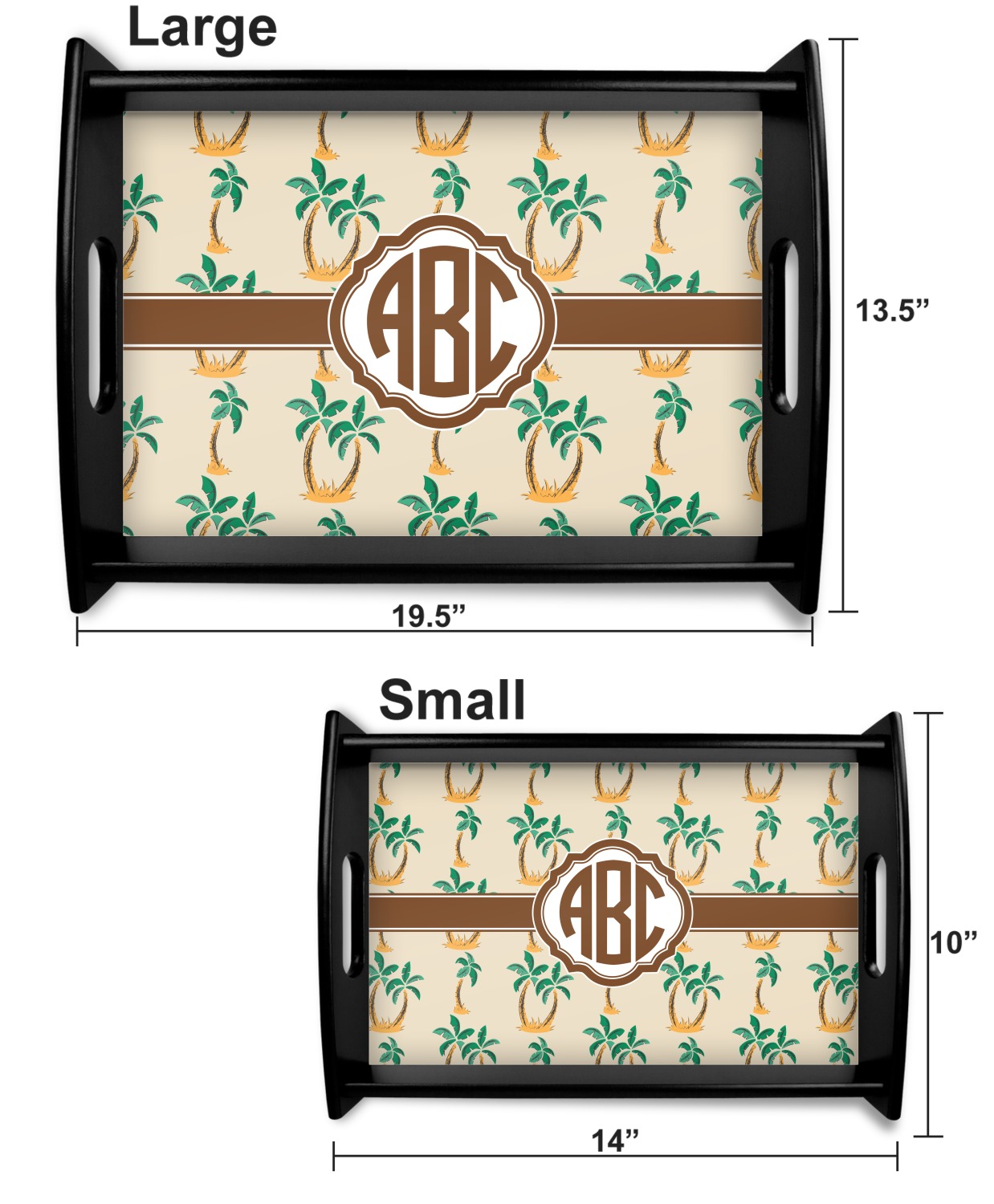 This serving tray with handles features square edges and two rounded sides, creating a very modern look. Each side is fabricated from a beautifully cut, natural wood. The bottom of the interior of the tray displays your customized design in bright, vibrant color. The tray is sold in both a black color and a natural wood look. Each variation of the wood serving tray has two sizes: Small, which is 14" x 10" x 2.25", and Large, which is 19.5" x 13.5" x 2.75".