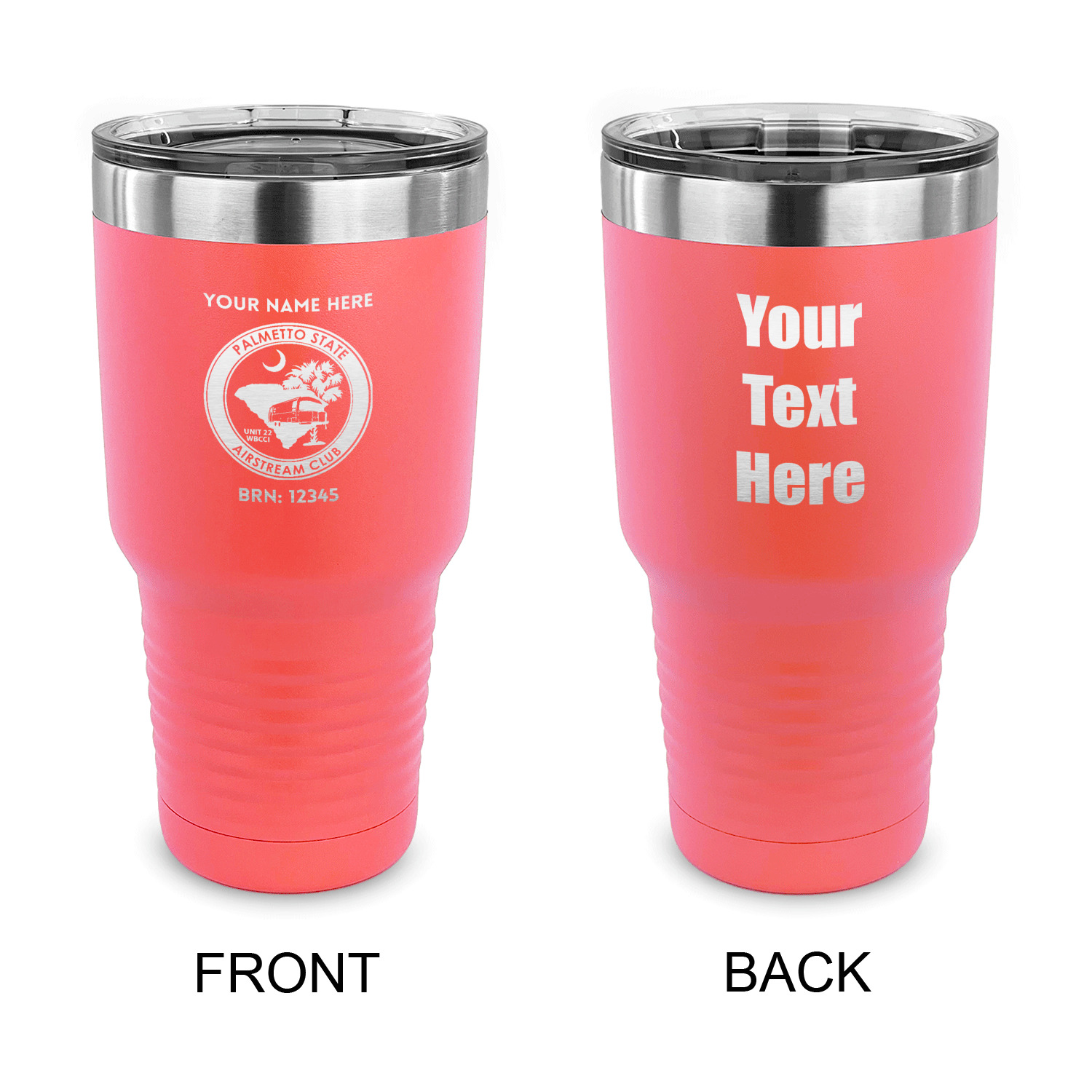With the 5 colors - Black, Navy, Red, Pink and Coral, you are sure to find a cup to fit your personality. You can chose to engrave on the front or the front and back of the cup. Use our design studio to design your own cup and we laser engrave it for you.