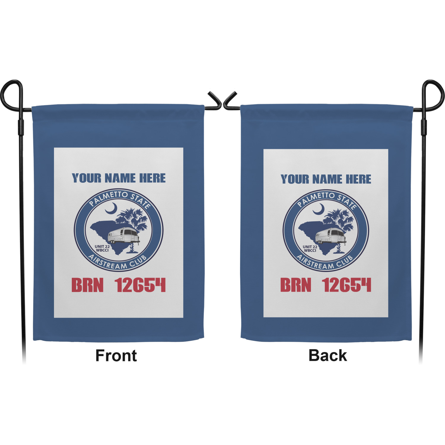 These custom garden flags are made of a durable, double-ply, polyester weave, allowing them to withstand the elements year round. The small flags measure at approximately 12 by 18 inches. The large flags measure out to 28 by 37 inches. You can order these decorative flags with your customization printed on the front only, or the front and back.