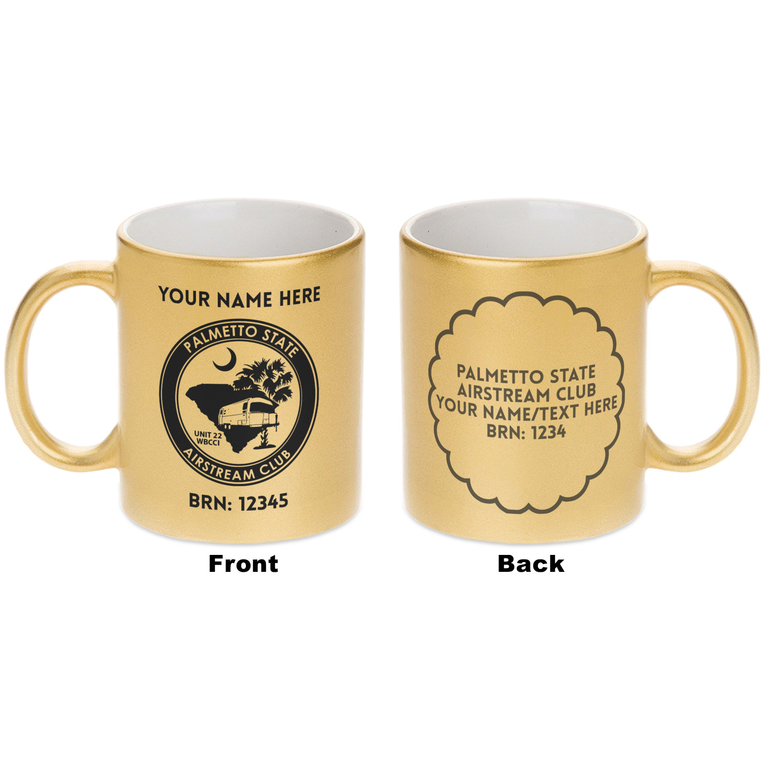 Our custom mugs are ceramic, which is great for keeping your tea or coffee warm! We offer two metallic mugs to personalize - Silver or Gold. Both styles hold around 11oz and have dimensions of approximately 3.75" x 3.5" x 4.75". Both the metallic mugs come in a matte finish and have glitter detailing to add a more pristine feel to the gold and silver base colors.