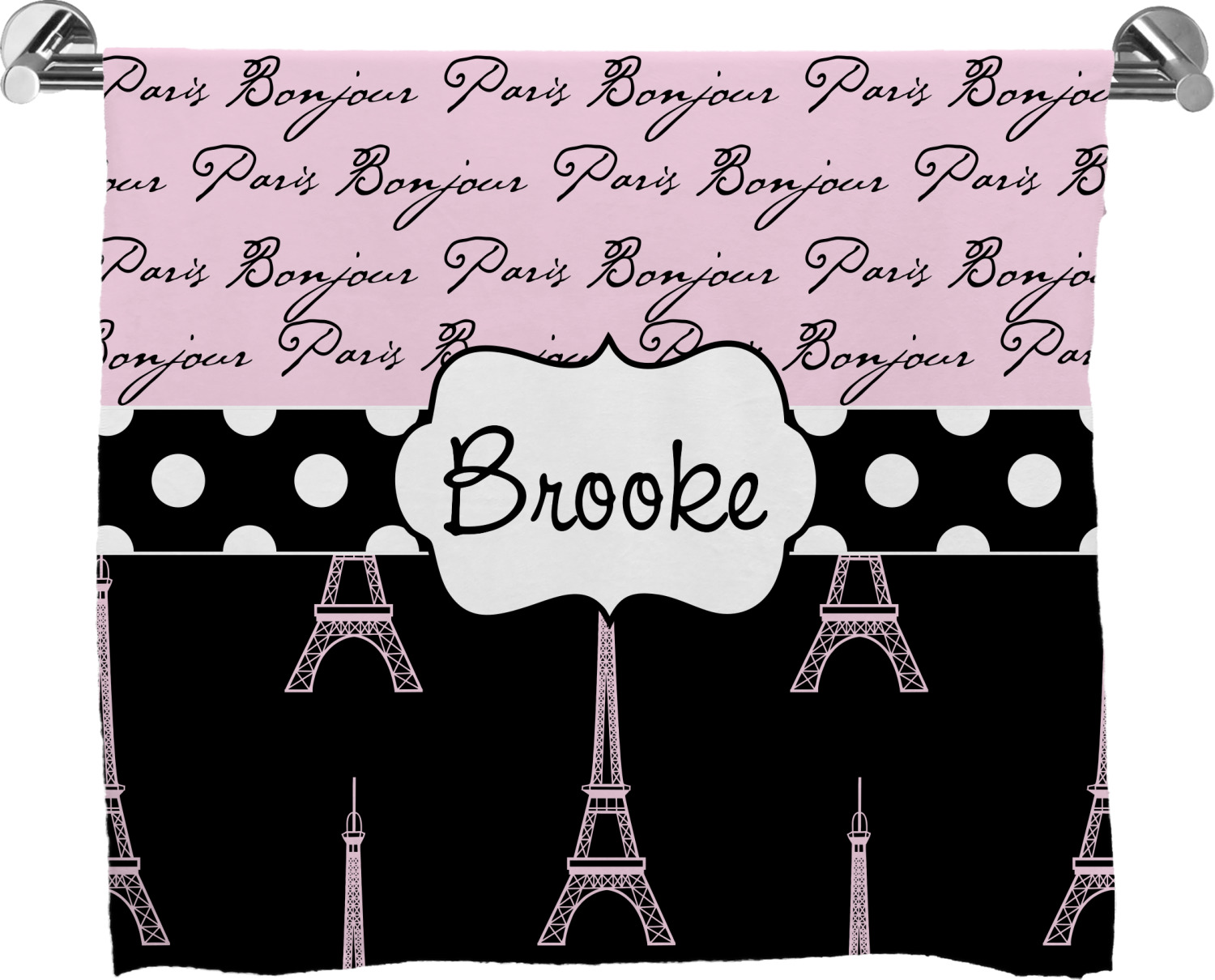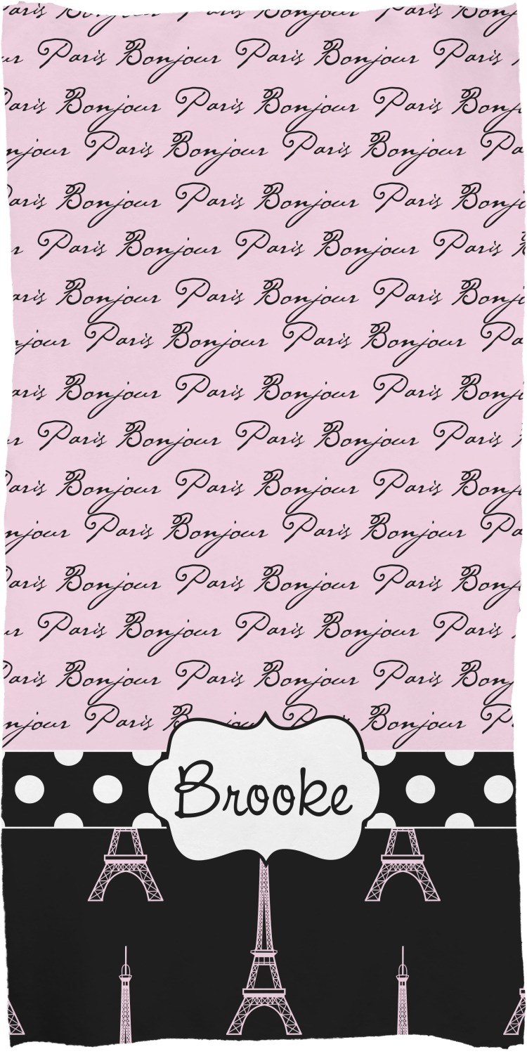 These customized bath towels are slightly larger than your standard towel and are the ideal size for wrapping around your body. They measure approximately 60" x 30". Your customization is displayed across the entire front face of the towel, while the back is white.