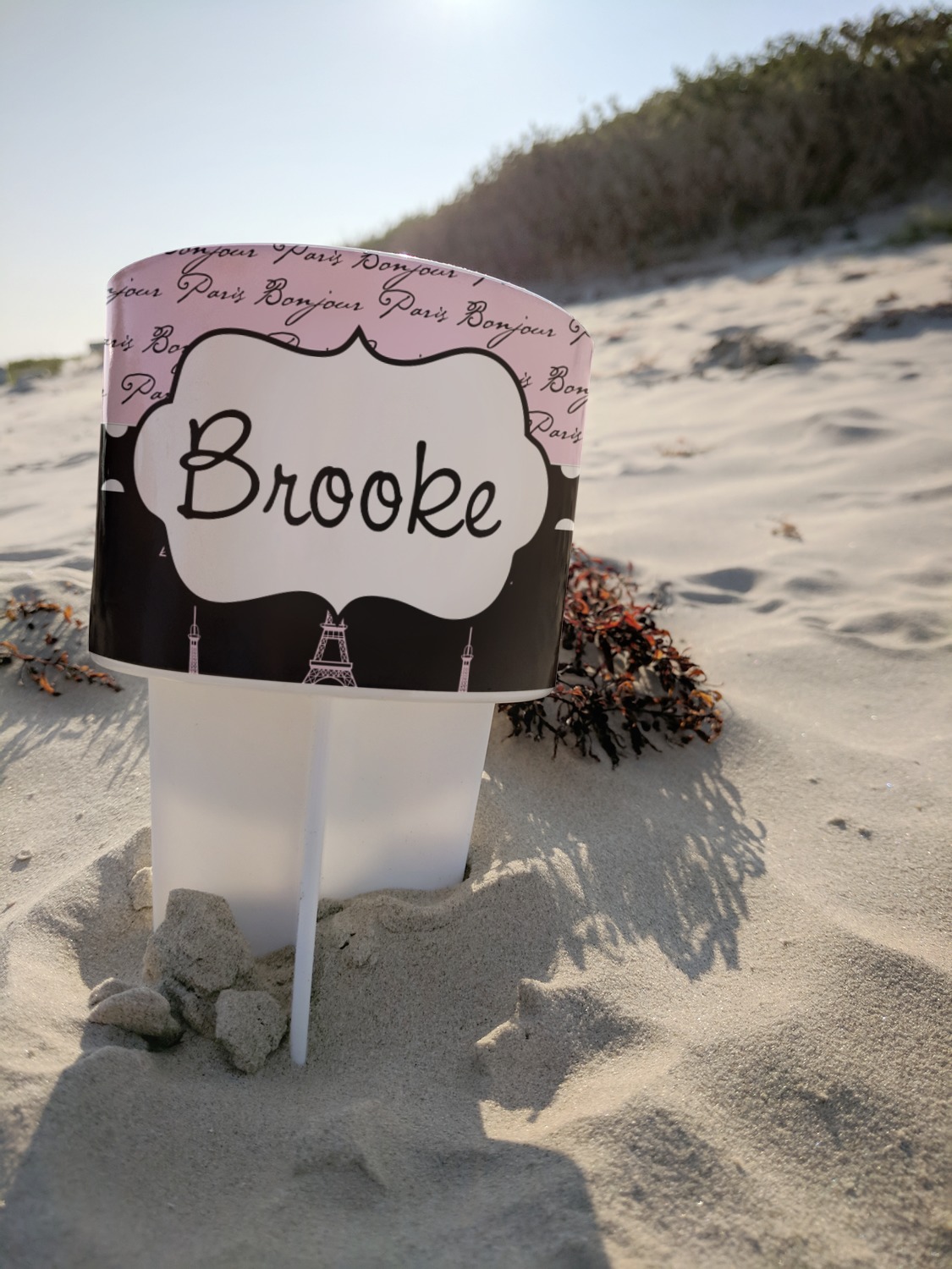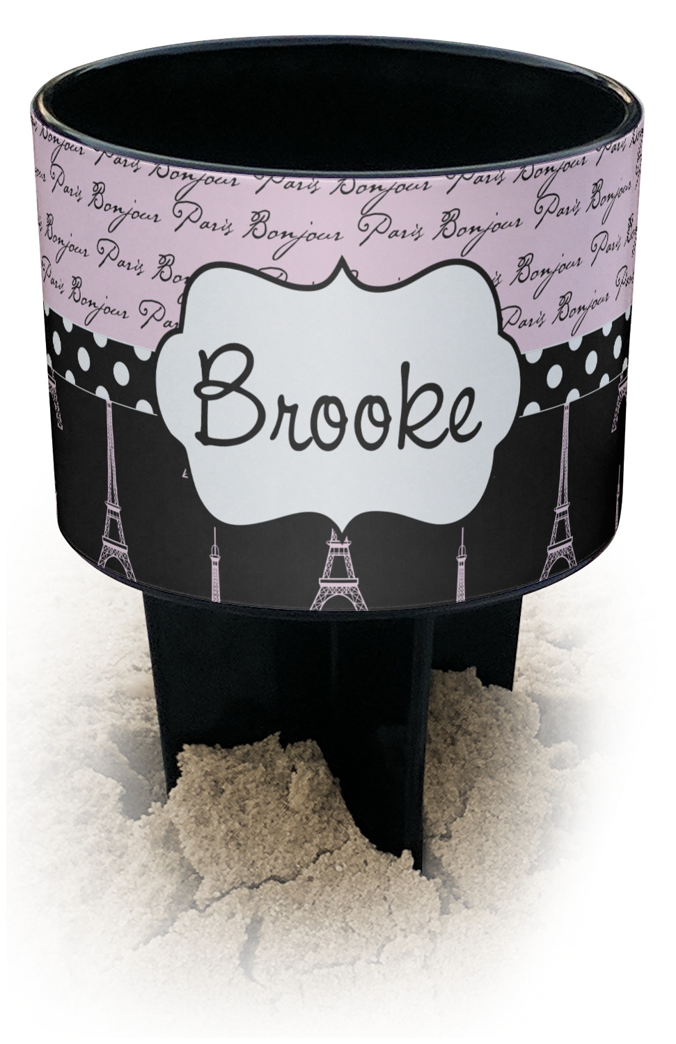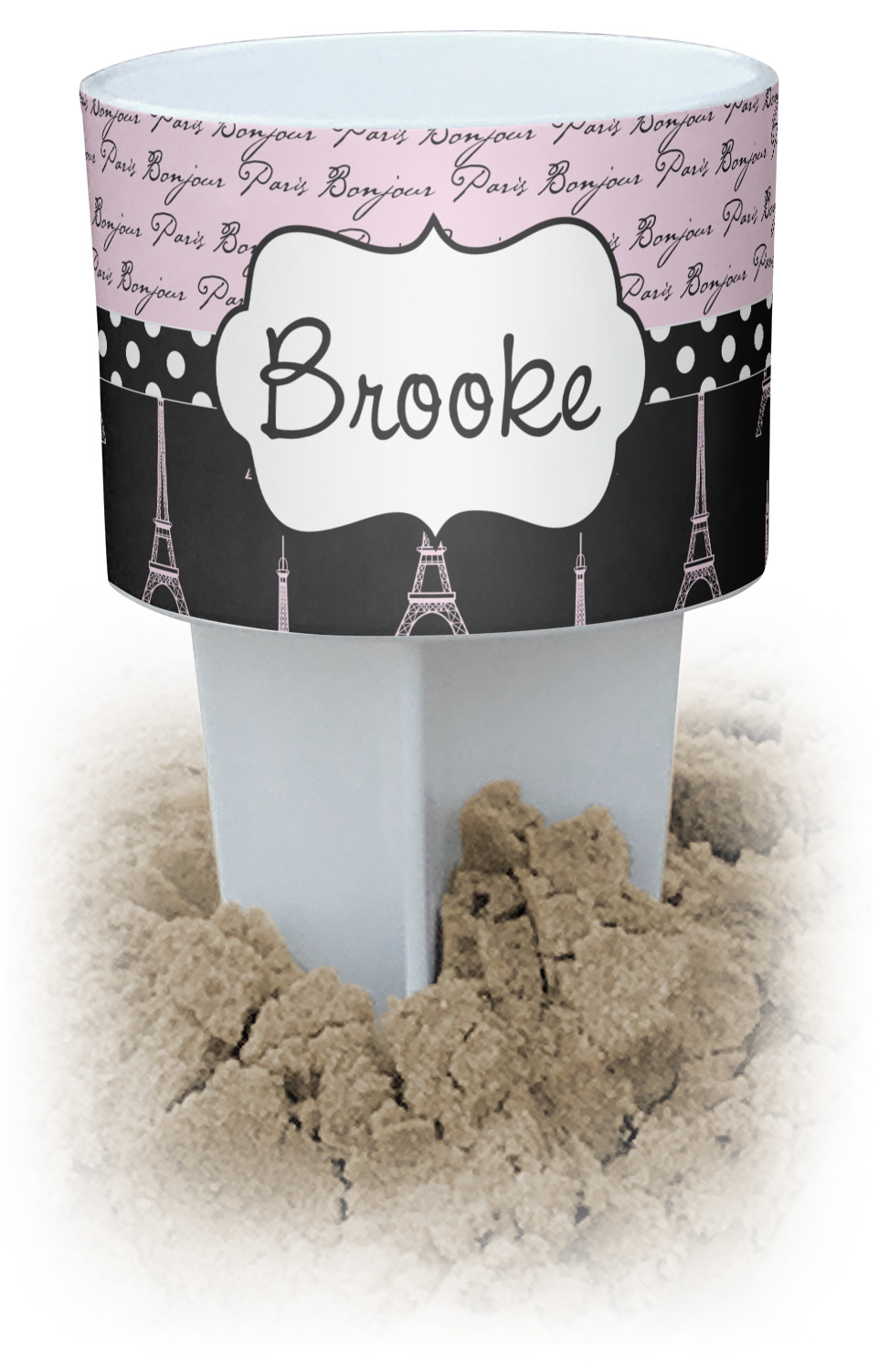 This cup holder has a large stake at its bottom that anchors it to the sand or ground below, while the cup holder rests above the stake. The entire drink holder is made of durable plastic and displays your customization around the cup holder portion. We sell these personalized beach spikers in two different colors: black and white.