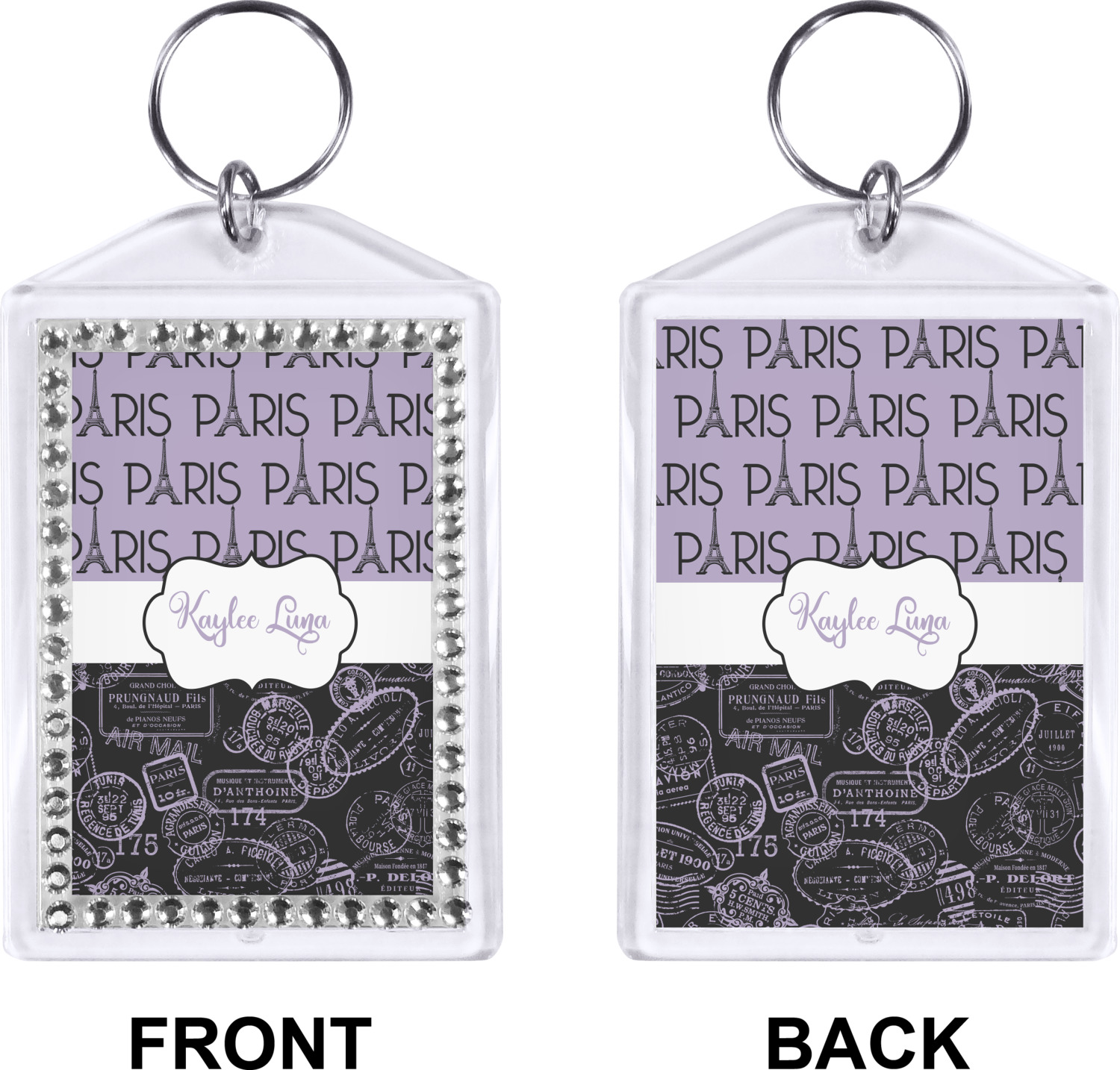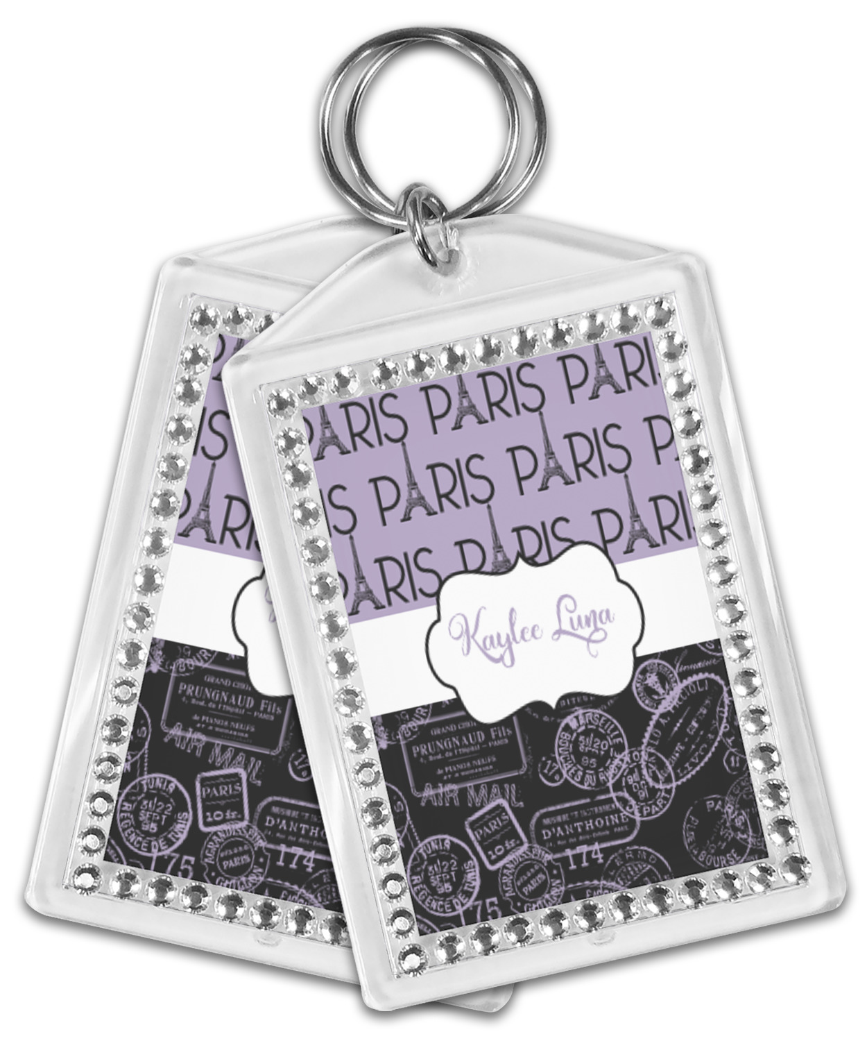 Our personalized keychains have a bold, rectangular shape, outlined by a series of shimmering rhinestones. A metal, split keyring is included with your purchase, and an additional metal hoop allows for attachment of the keychain to the split ring. This unique keychain measures at about 3.75 by 2.5 inches. We print your customized design(s) across both the back and front of this keychain.