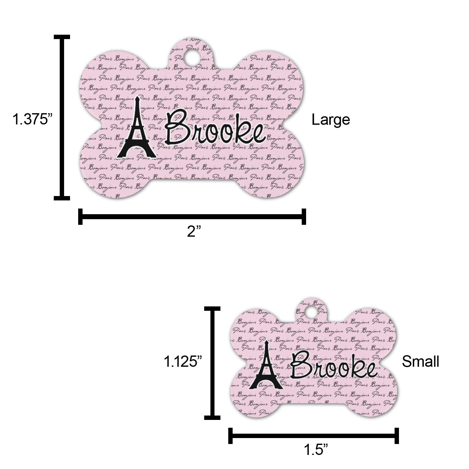 The small bone dog tag size is perfect to pair with our small dog collars, the large size pairs well with our large dog collars.