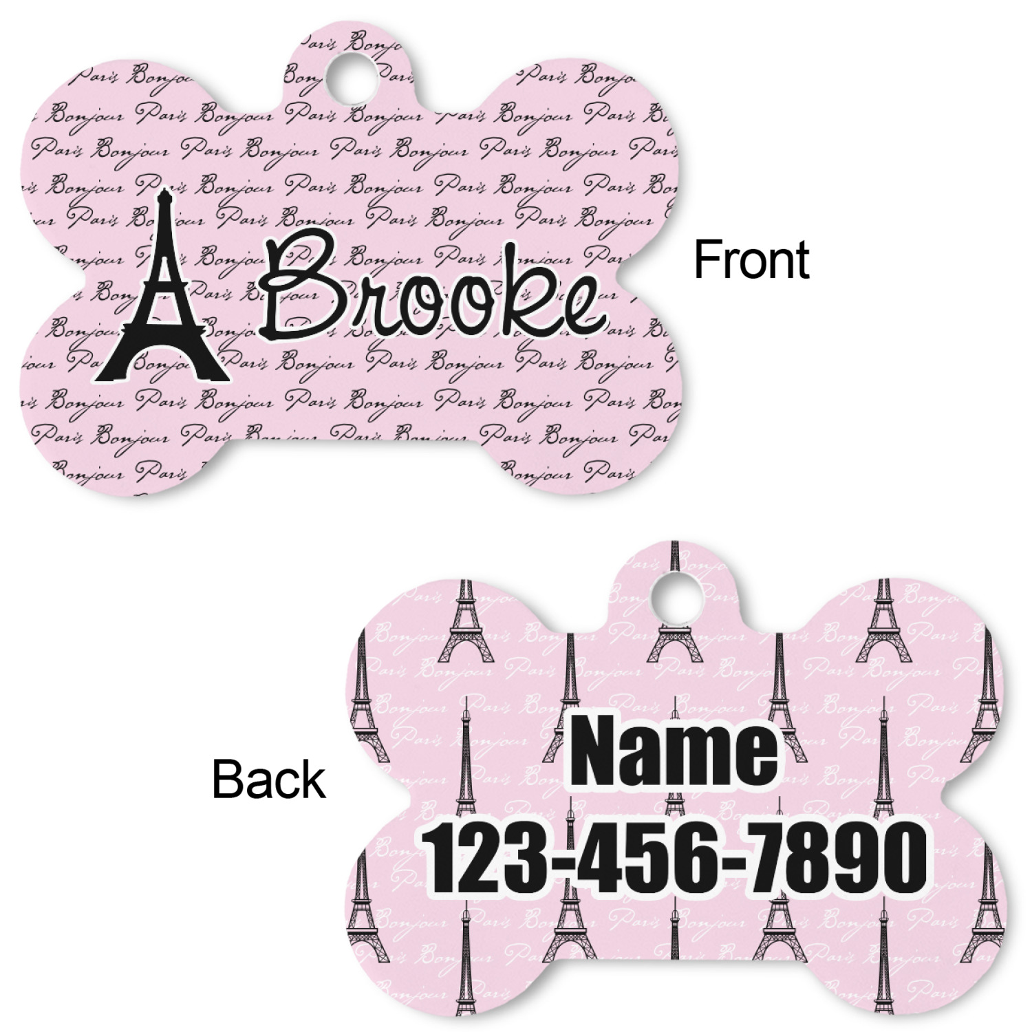 Our default design templates print your dog's personalization on the front and your contact information on the back; however everything is customizable, so you customize the patterns, the colors, the personalization, the contact information etc.
