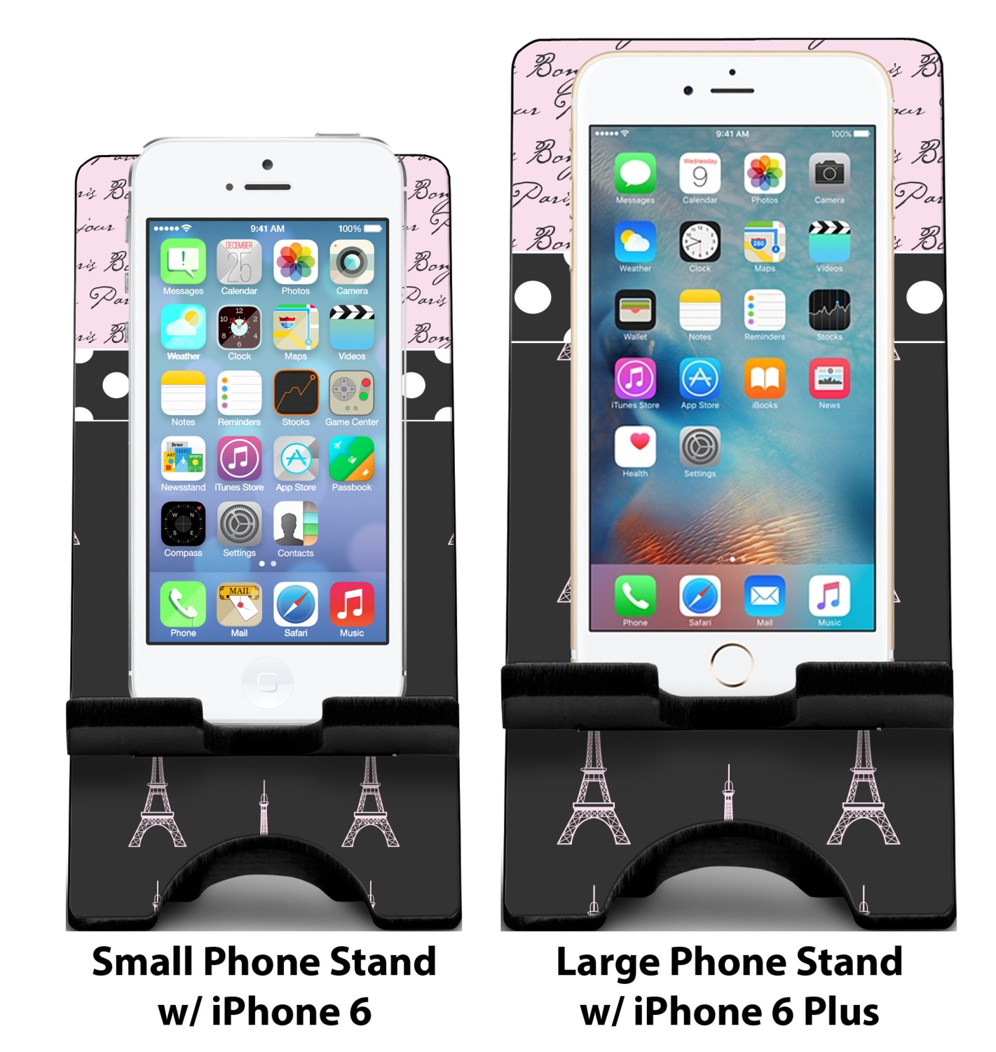 To meet your needs, we offer four variations of this IPhone stand. The backboard of the first version is shaped as a plain, yet sleek rectangle, and is available in two sizes. Our smaller size is approximately 4 by 3.25 by 7 inches, while the larger model is 4 by 3.77 by 8.5 inches. Alongside this model, we also provide you with a more decorative option. The upper part of our second version features a curved edge, for a classy, suave appearance. This phone holder is also sold in two sizes: a smaller version, which is 4 by 3.25 by 7 inches, and our larger model, which is 4 by 3.77 by 8.5 inches. Both models will support large phones, but the larger model is better if you wish to proudly display your personalized design.