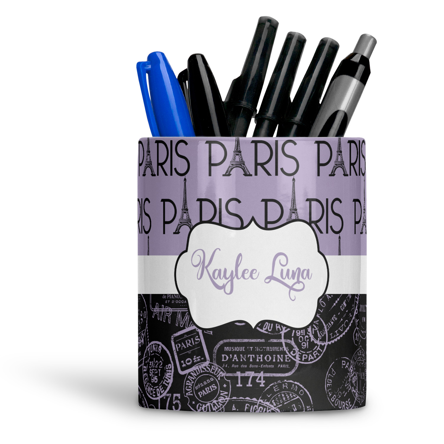 Made from white ceramic, this pen holder displays your personalized design across its surface. This pen organizer measures at 3.75" high by 3.25 inches diameter and has ample space for several pens, pencils, scissors, markers, and more! This is also a multipurpose accessory; you can use it to store makeup brushes, other utensils, and more!