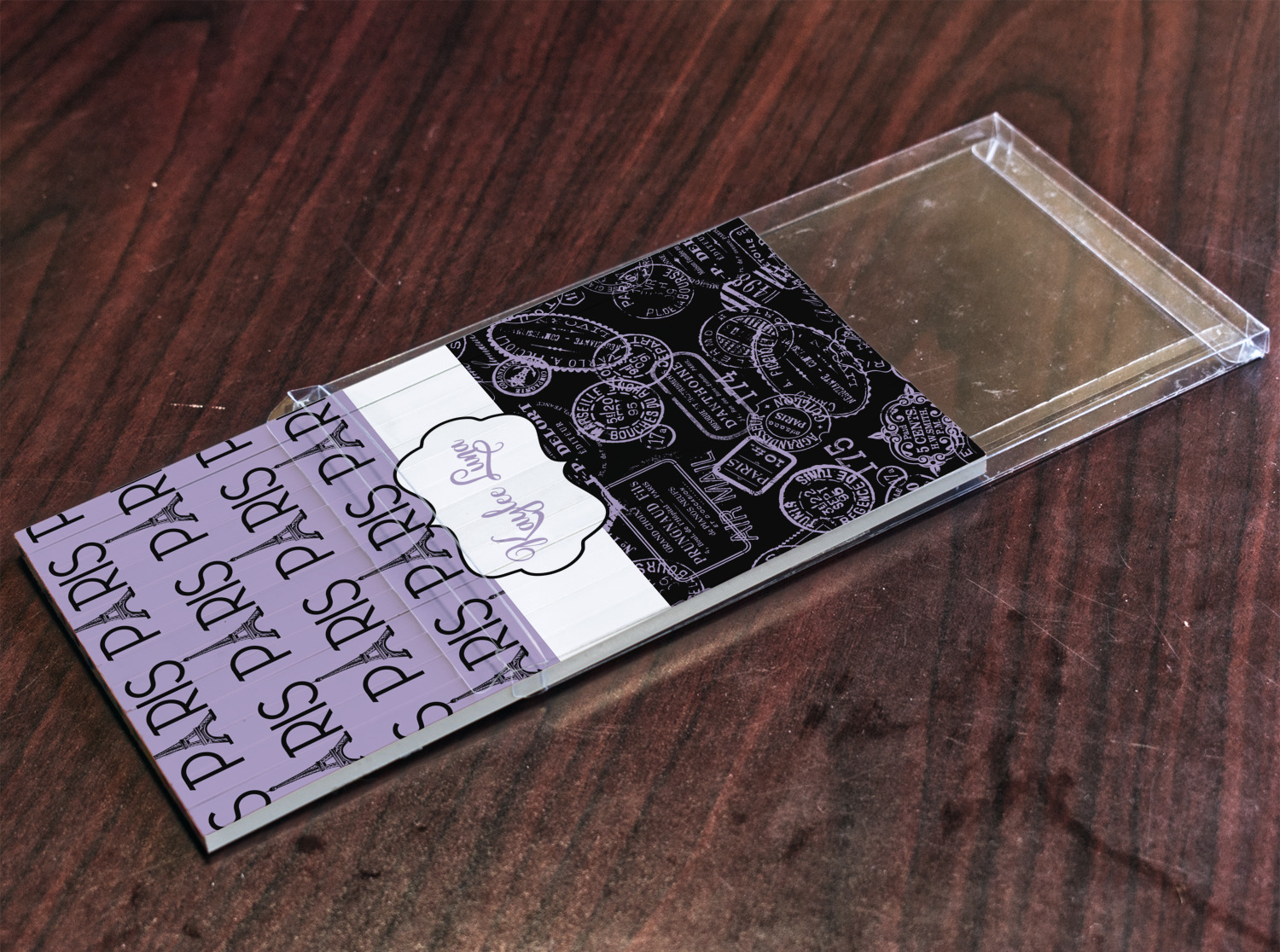 A gorgeous wide black and white polka dot band adds a touch of French whimsy. The beautiful white label highlights the personalization of your choice.