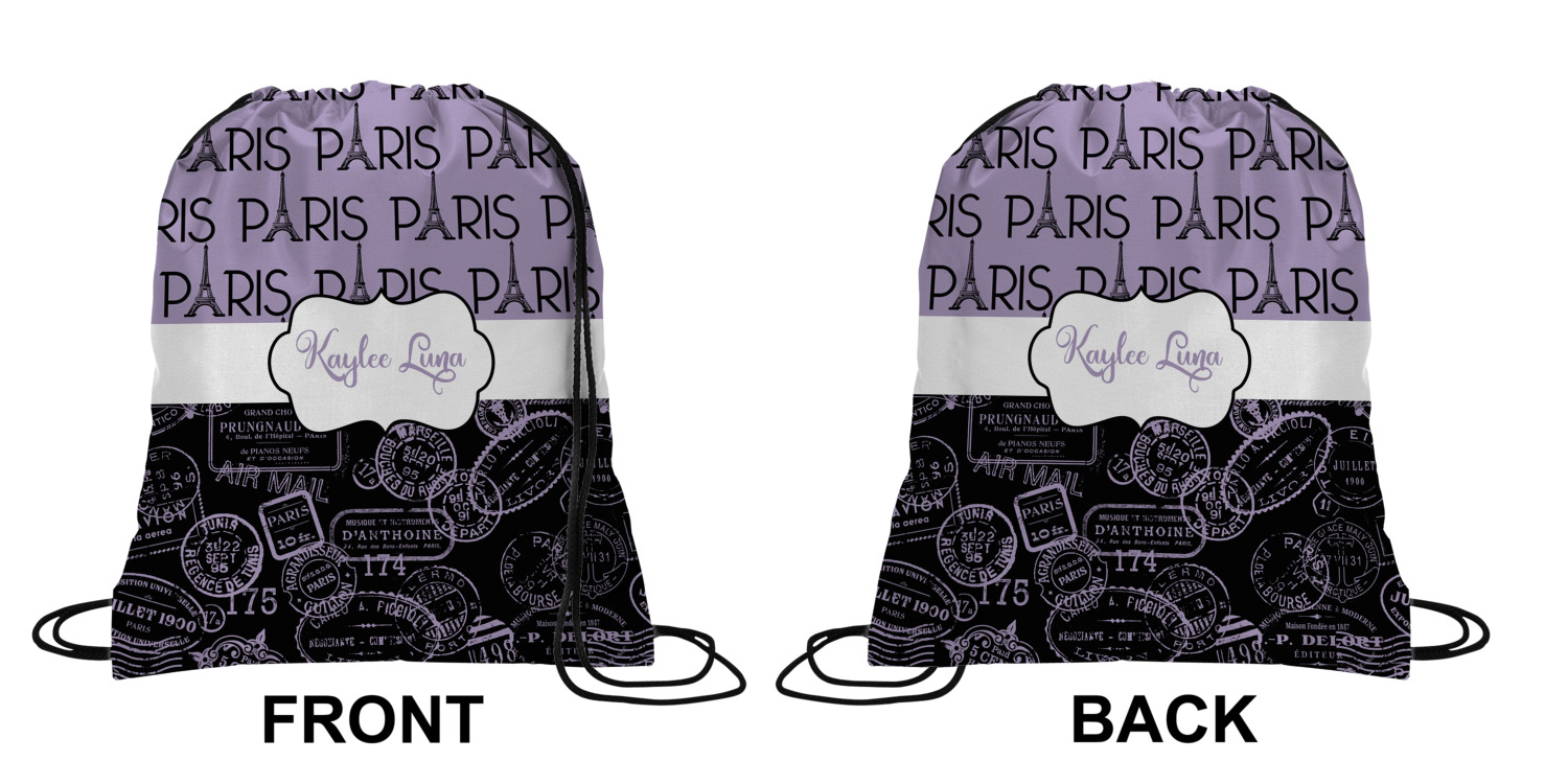 Your custom design will appear on the front and the back of the backpack. You can customize each side individually. The inside of the backpack is white and the drawstrings are black. The back pack is made of 100% polyester fabric.