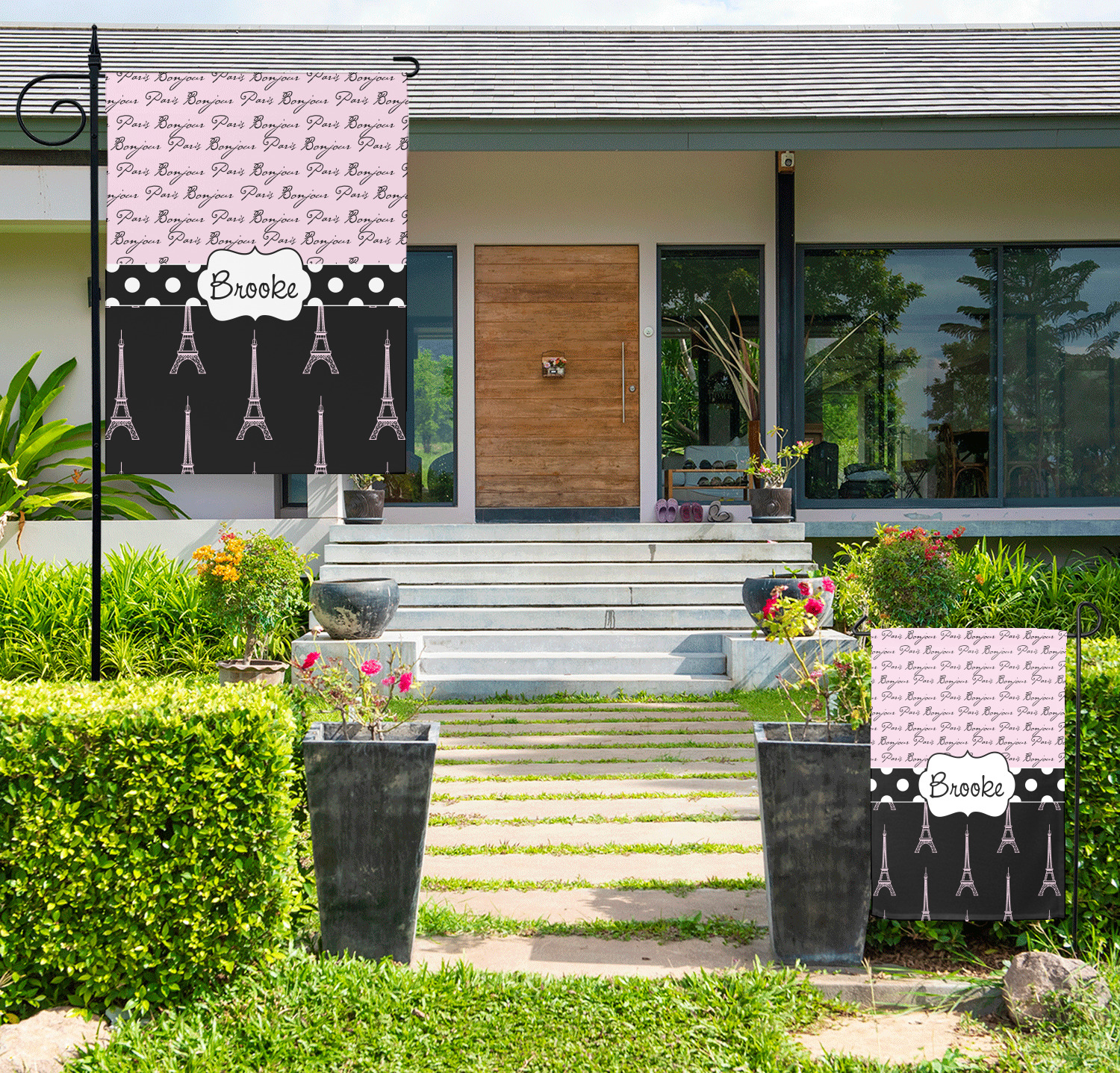These custom garden flags are made of a durable, double-ply, polyester weave, allowing them to withstand the elements year round. The small flags measure at approximately 12 by 18 inches. The large flags measure out to 28 by 37 inches. You can order these decorative flags with your customization printed on the front only, or the front and back.