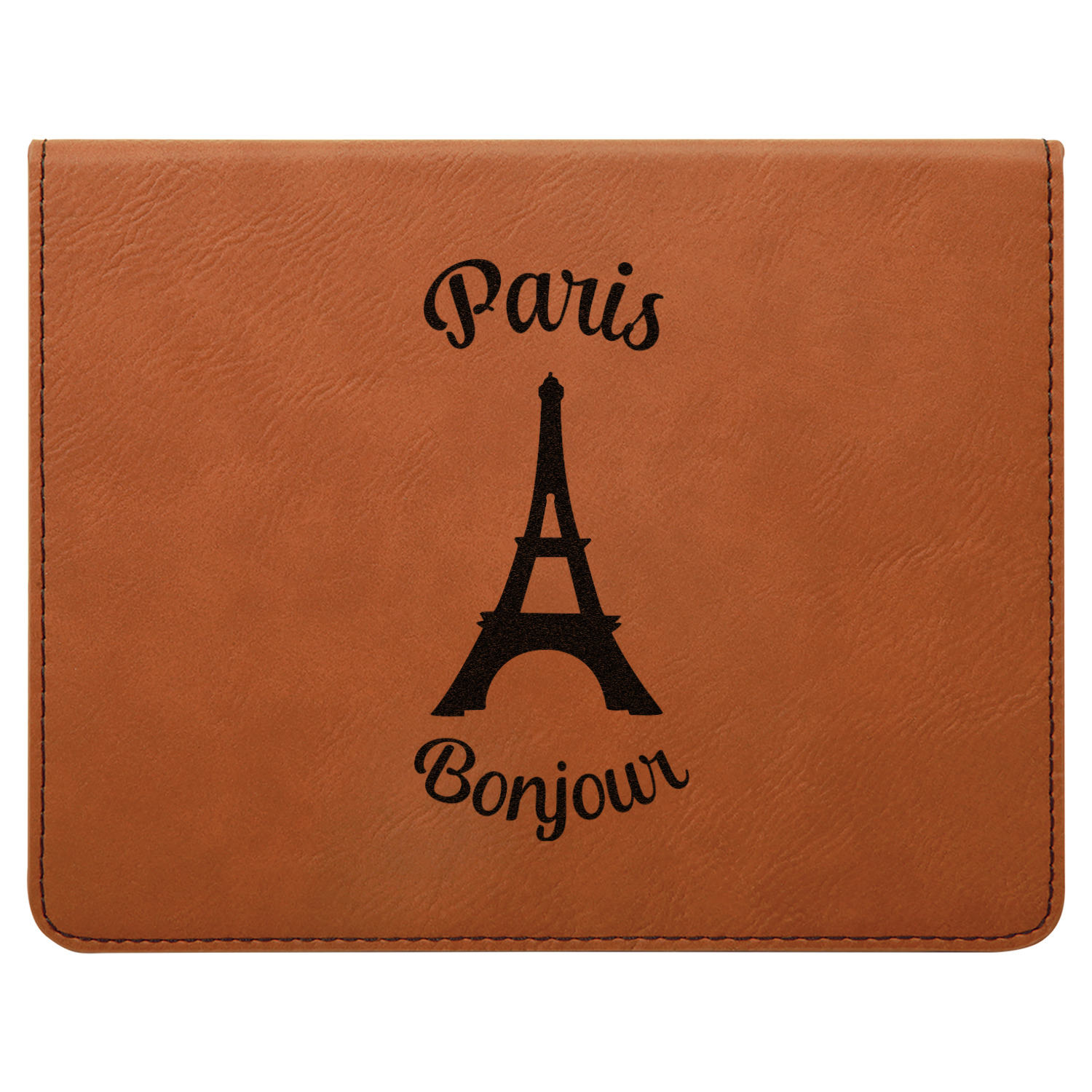This set includes a wine stopper, pourer, drip ring, and a corkscrew! The exterior of the box is a gorgeous, cognac-brown leatherette, while the interior is covered in a black, velvety material. Four foam indentations, unique to the shape of the wine tool, are found at the bottom half of the box's interior. The tools fit snugly into each of their designated spots, and the foam material helps to protect the integrity of your tools. Each of the wine gadgets features a bamboo accent, with the location and style depending on the tool itself. We laser engrave your personalized design onto the lid of the box, which easily flips open and is secured closed by a small magnet. The wine accessories box measures at 7 by 5.5 inches in total.