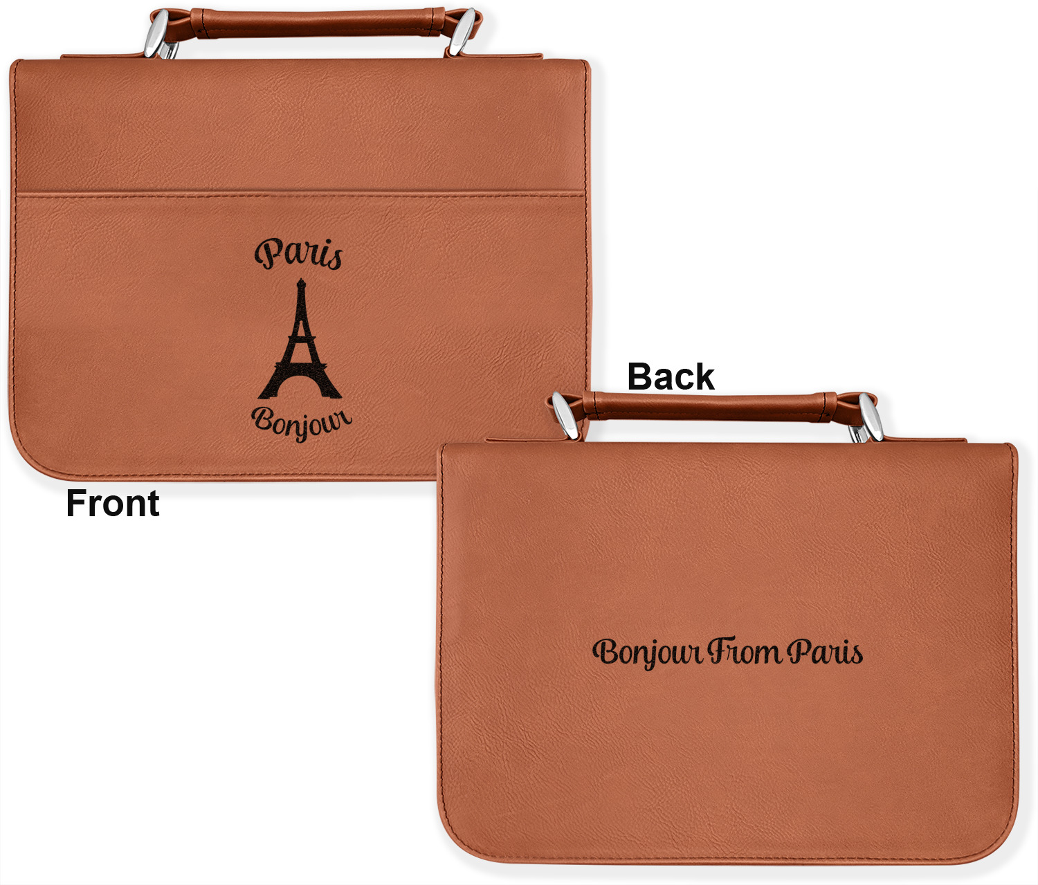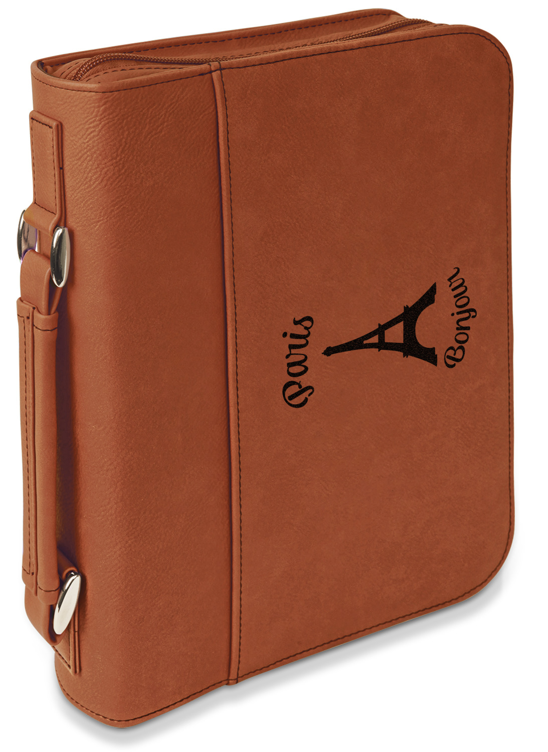 These book covers are fabricated from a fine leatherette in a warm, cognac shade of brown. A wide pocket spans across the front of the book jacket [2,400] and can store any loose papers or notes that you wish to keep. The interior of this personalized Bible cover includes slots on both sides to house the covers of your Bible, and keep it in place. The inside of the spine has a small elastic band to secure a pen. A zipper lines three sides of the cover, while the fourth side features a reinforced handle that allows for easy transport of your enclosed book.