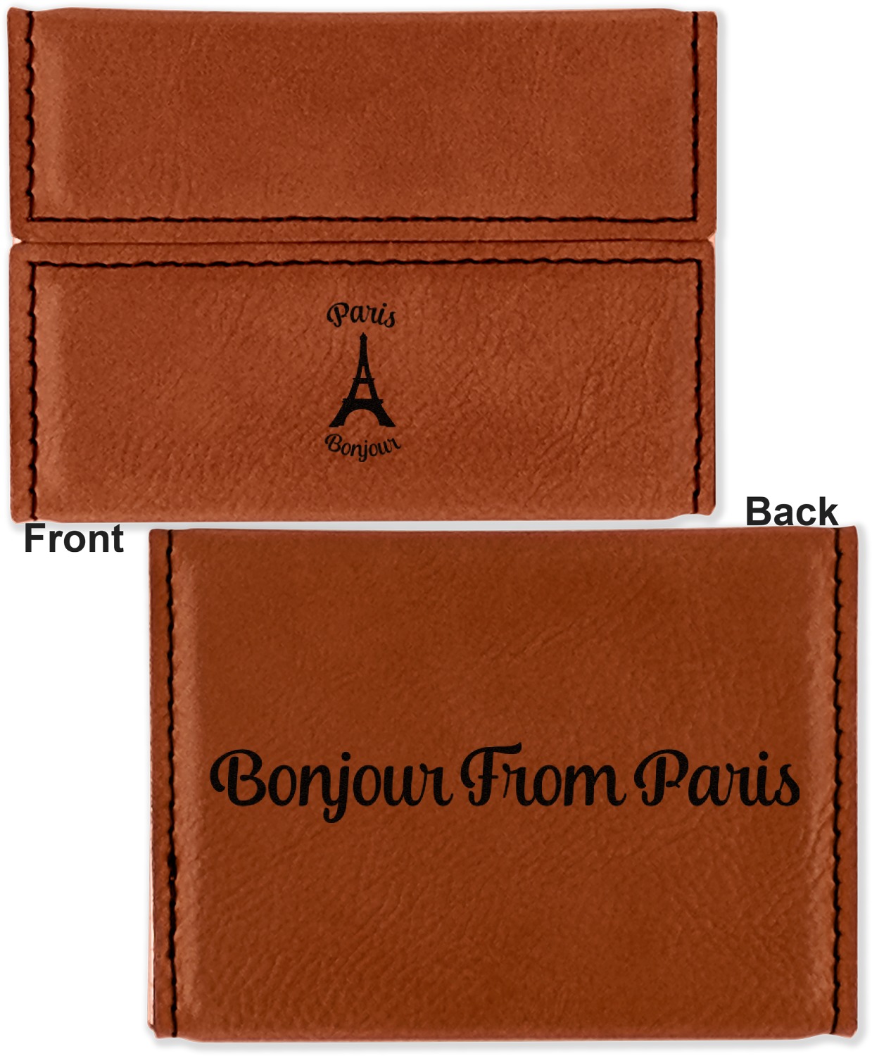Your personalized design is laser engraved onto either the front, or the front and back of the card holder, depending on the model you purchase. Once engraved, the design will appear a darkened black against the cognac color of the leatherette.