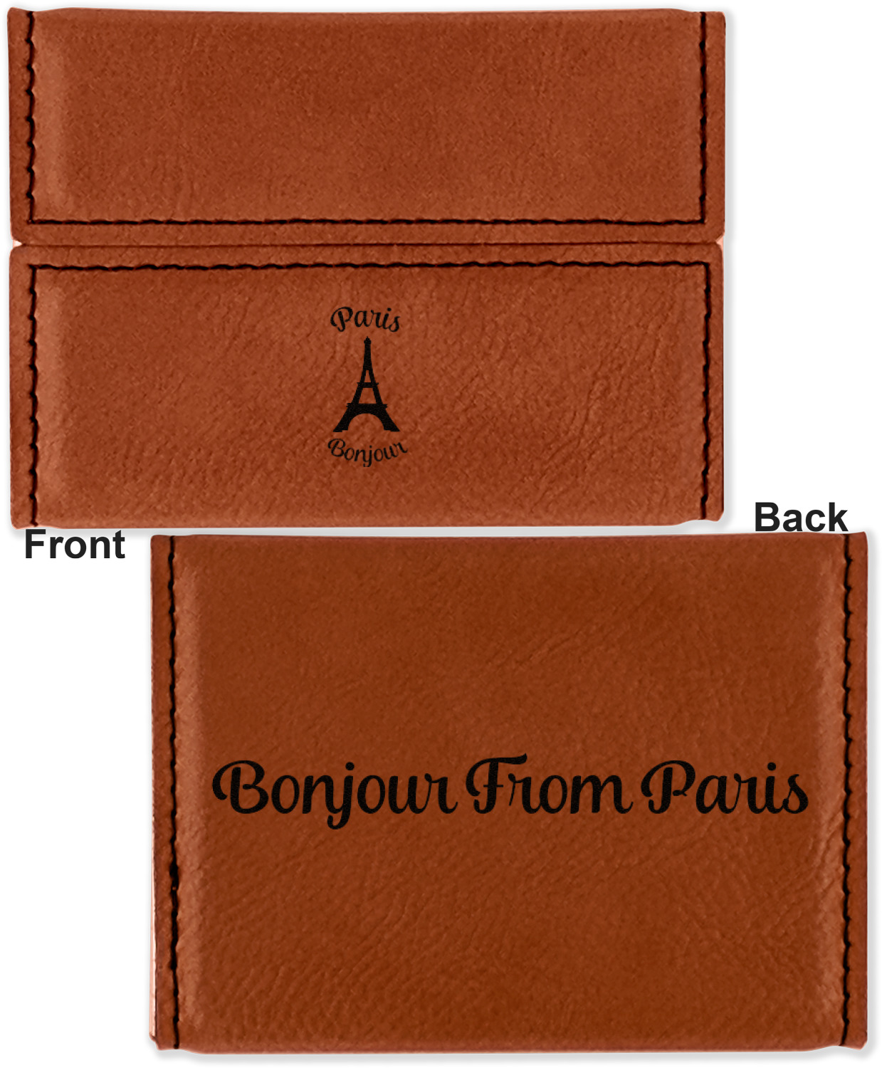 Your personalized design is laser engraved onto either the front, or the front and back of the card holder, depending on the model you purchase. Once engraved, the design will appear a darkened black against the cognac color of the leatherette.