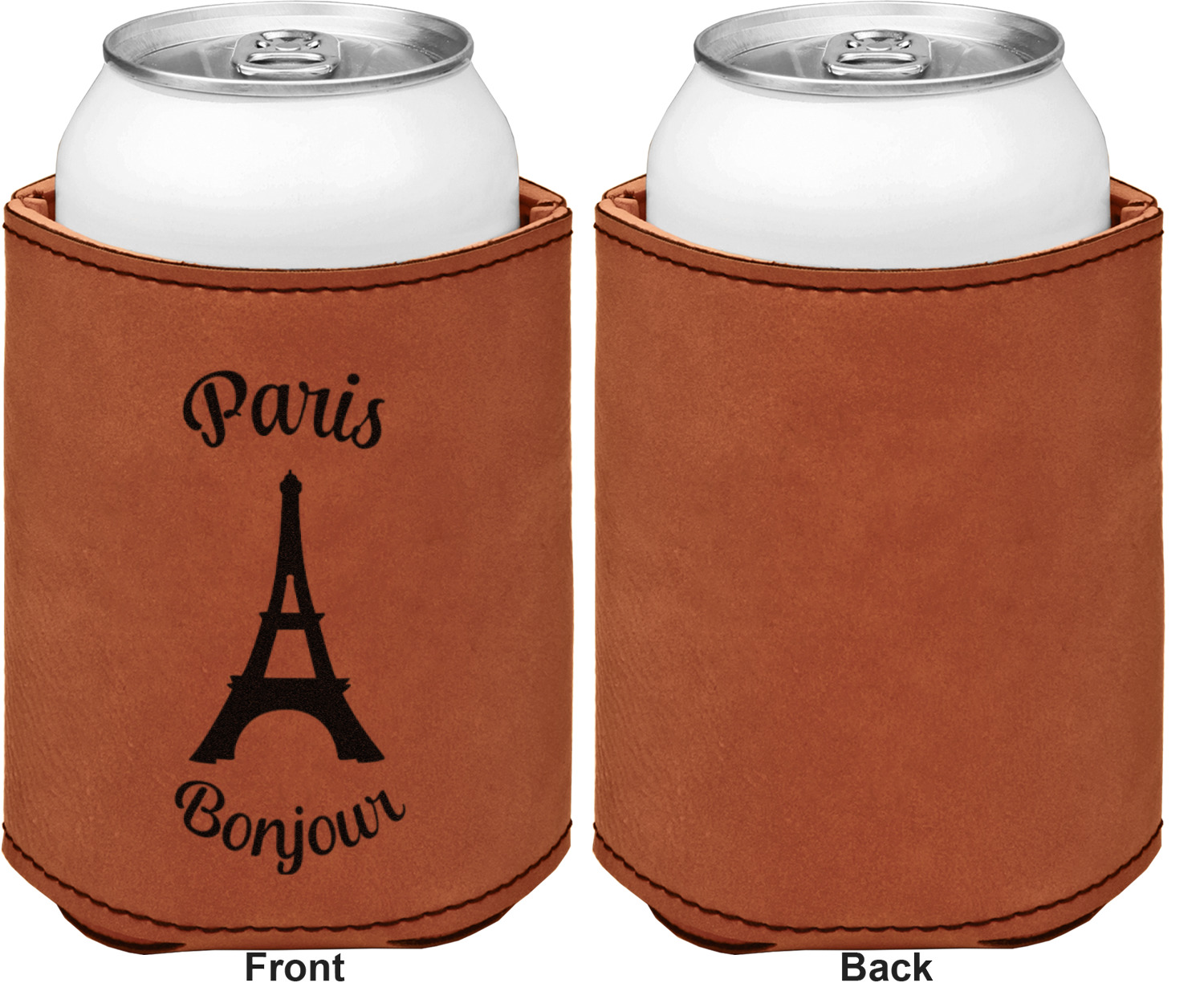 This can sleeve is made from a cognac-brown leatherette and stitched with a sturdy, black thread. A slim padding lines the inside of your can sleeve to allow for a better fit once your drink is inserted. The sleeve itself measures at 4 by 4.5 inches, allowing this custom can sleeve to accommodate most canned drinks. Your personalized design can be engraved on the front and back, or solely the front. When laser-engraved, your design appears as a black coloration which contrasts the leatherette nicely.