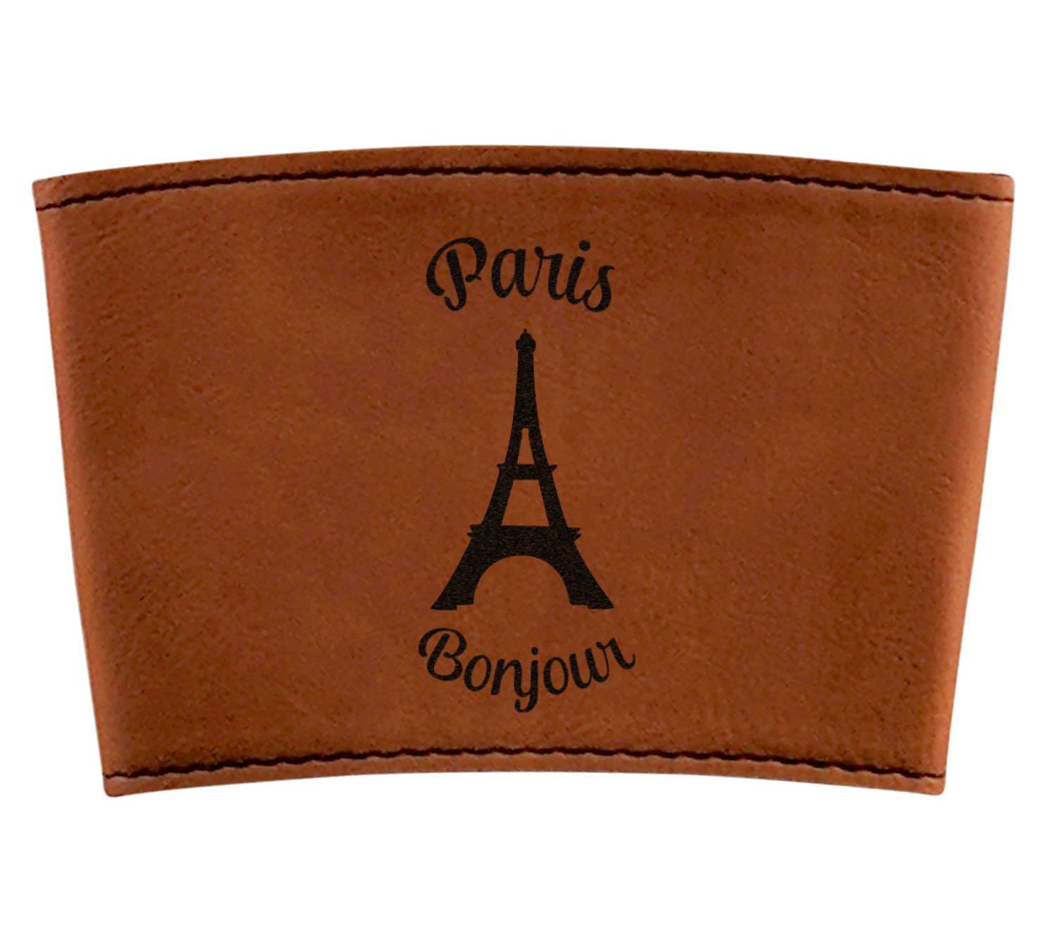 This cup sleeve is made from a suave, cognac-brown leatherette and finished with an intricate, black stitch. The interior of this can sleeve is fabricated from a thin foam material to help insulate your mug's contents. The sleeve is specifically made to suit tapered glasses or mugs, so the top's diameter is 3.5 inches, while the bottom's diameter is 2.75 inches. Your customized design will be laser engraved into the leatherette, leaving behind crisp, black imprint. With these products, we provide you with the option of engraving the front and back, or the front only.