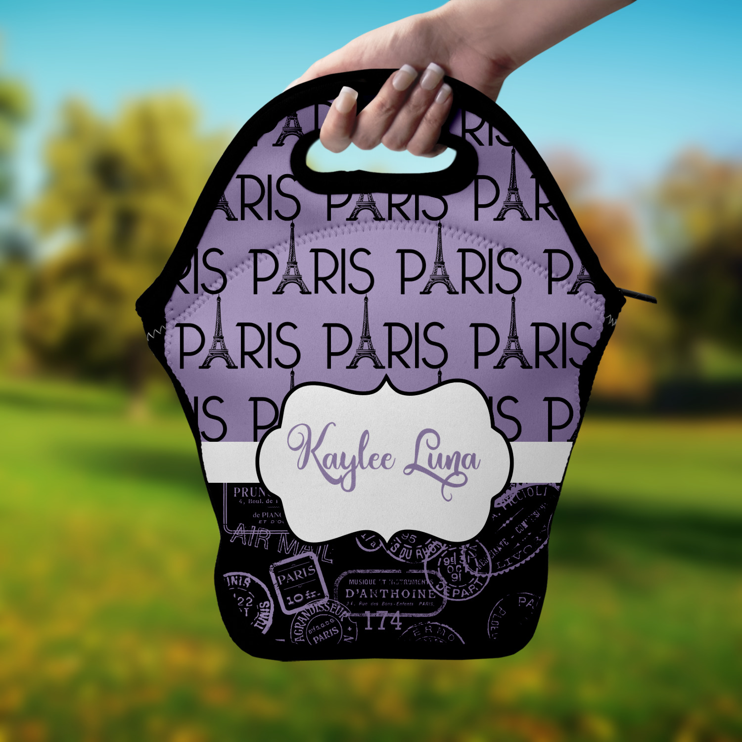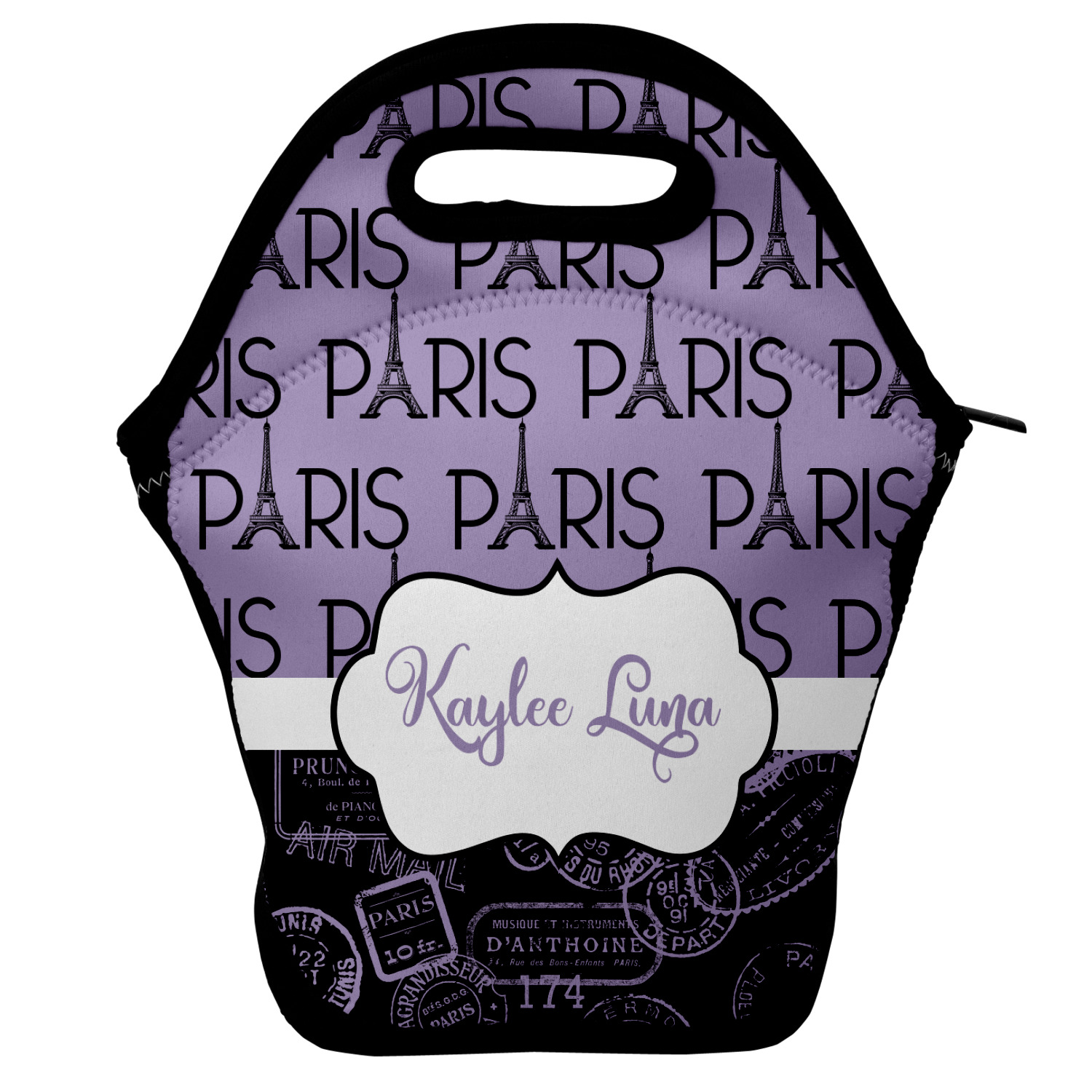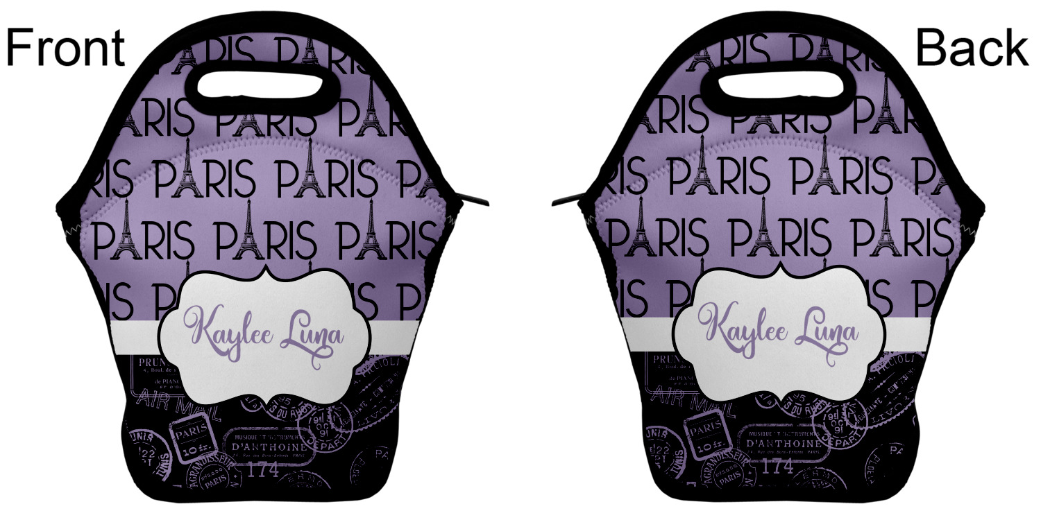 Our personalized lunch bags are made from a strong neoprene, and secure with a zipper closure that lines the top of the bag.The edges of the neoprene are sewn together with a heavy duty stitch, adding to the durability of the bag. The is accompanied by a reinforced handle at its top, for the easy transport of your lunch. We display your personalization across both the front and back of this neoprene lunch bag, while the remaining sides are a sleek black in color. Each bag measures at 13.5 inches tall, and 11.5 inches wide.