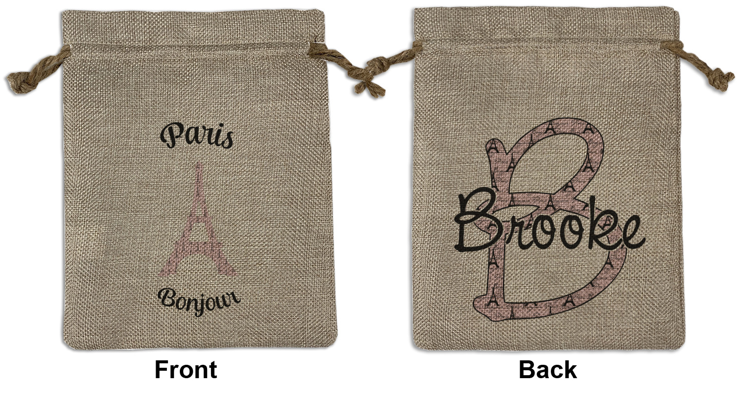 We sell our Burlap Gift Bags in 3 variant sized bags. Made with burlap polyester, each personalized bag can be secured with a twine drawstring pull. Your custom design is available to print on one side or both sides - completely up to you! The sizes of the bags measure approximately 4.5" x 6.5" for the smallest size, 6.5" x 8.0" for the medium size, and 6.5" x 13.5" for the large-sized bag.
