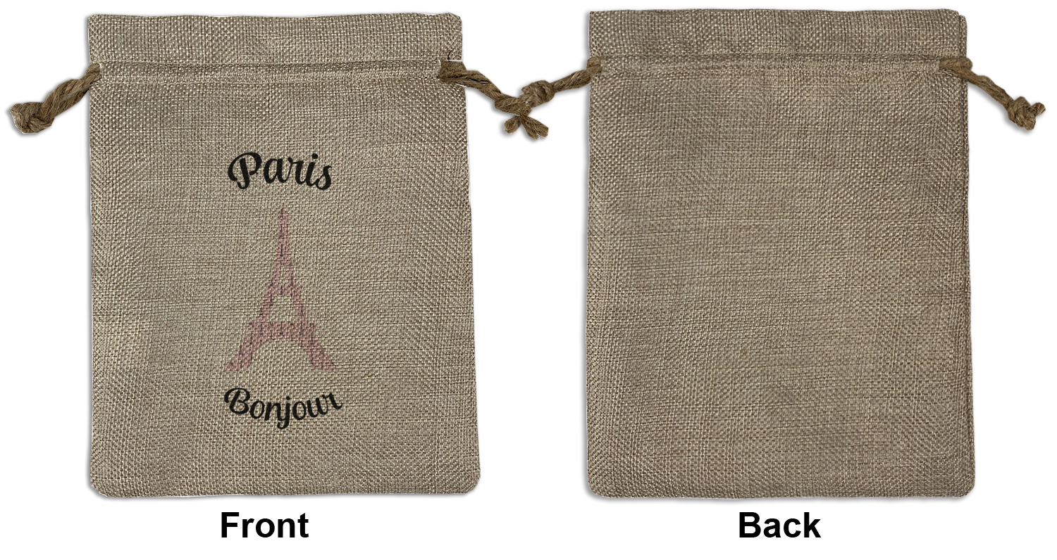 We sell our Burlap Gift Bags in 3 variant sized bags. Made with burlap polyester, each personalized bag can be secured with a twine drawstring pull. Your custom design is available to print on one side or both sides - completely up to you! The sizes of the bags measure approximately 4.5" x 6.5" for the smallest size, 6.5" x 8.0" for the medium size, and 6.5" x 13.5" for the large-sized bag.