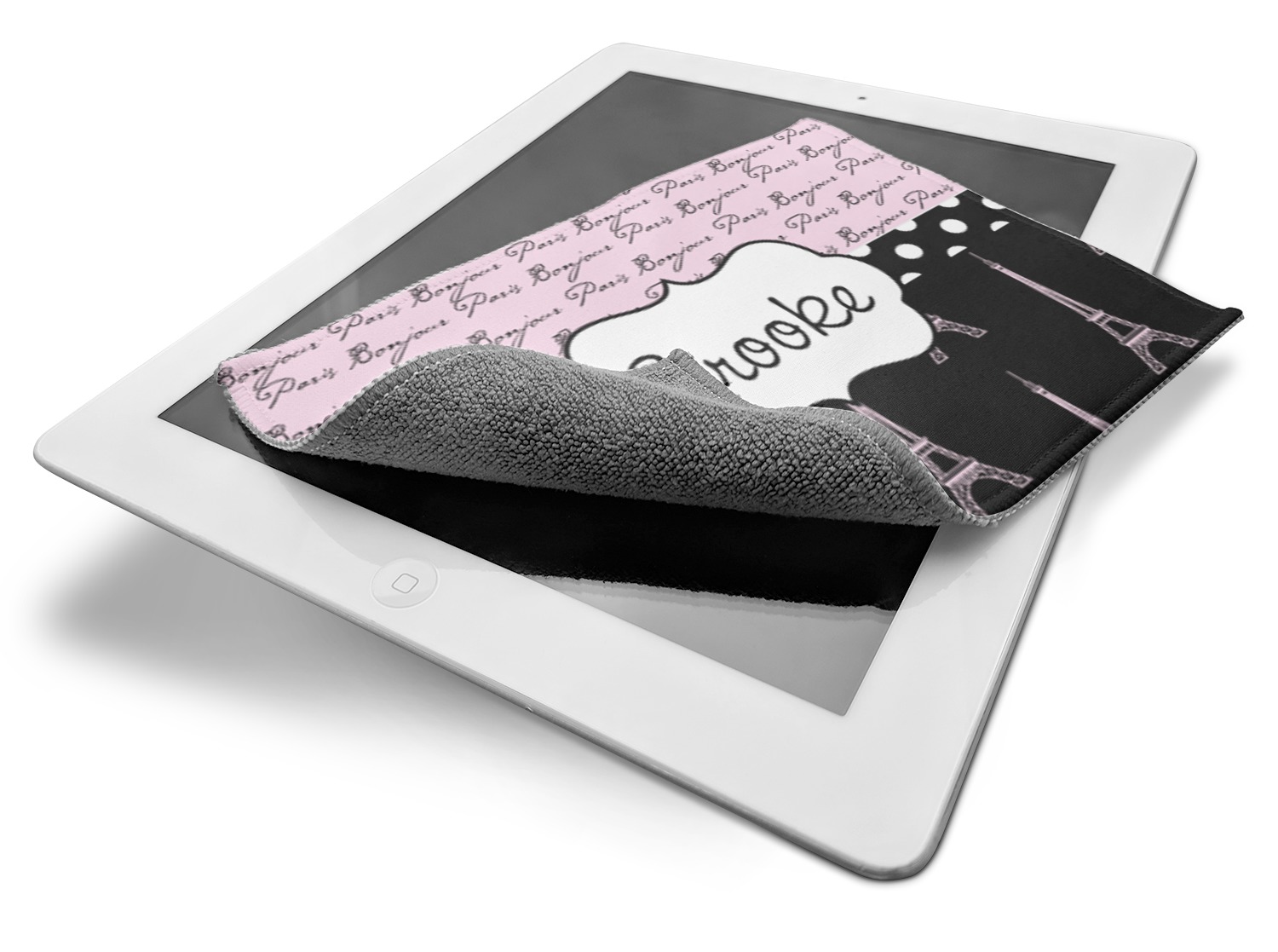 The back of this cleaning cloth is made from a gentle, grey microfiber material, that is masterful at removing smudges, grease, and fingerprints from lenses or electronic screens. The front side of the screen cleaner displays your personalized design in vibrant color. A beautiful stitch lines the edges and secures the microfiber to the polyester top. We provide you with the option of customizing this screen horizontally or vertically, depending on your preferences.
