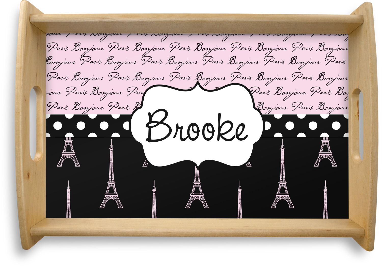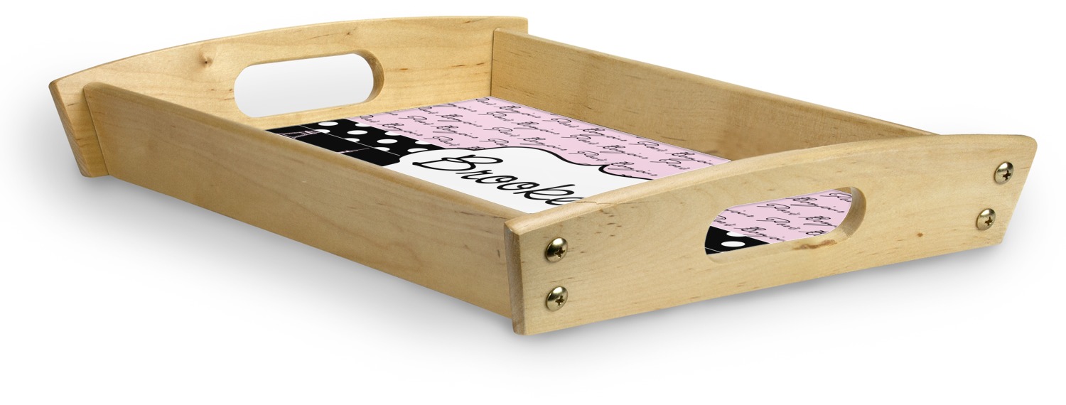 This serving tray with handles features square edges and two rounded sides, creating a very modern look. Each side is fabricated from a beautifully cut, natural wood. The bottom of the interior of the tray displays your customized design in bright, vibrant color. The tray is sold in both a black color and a natural wood look. Each variation of the wood serving tray has two sizes: Small, which is 14" x 10" x 2.25", and Large, which is 19.5" x 13.5" x 2.75".