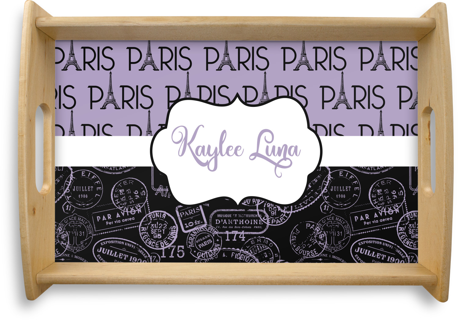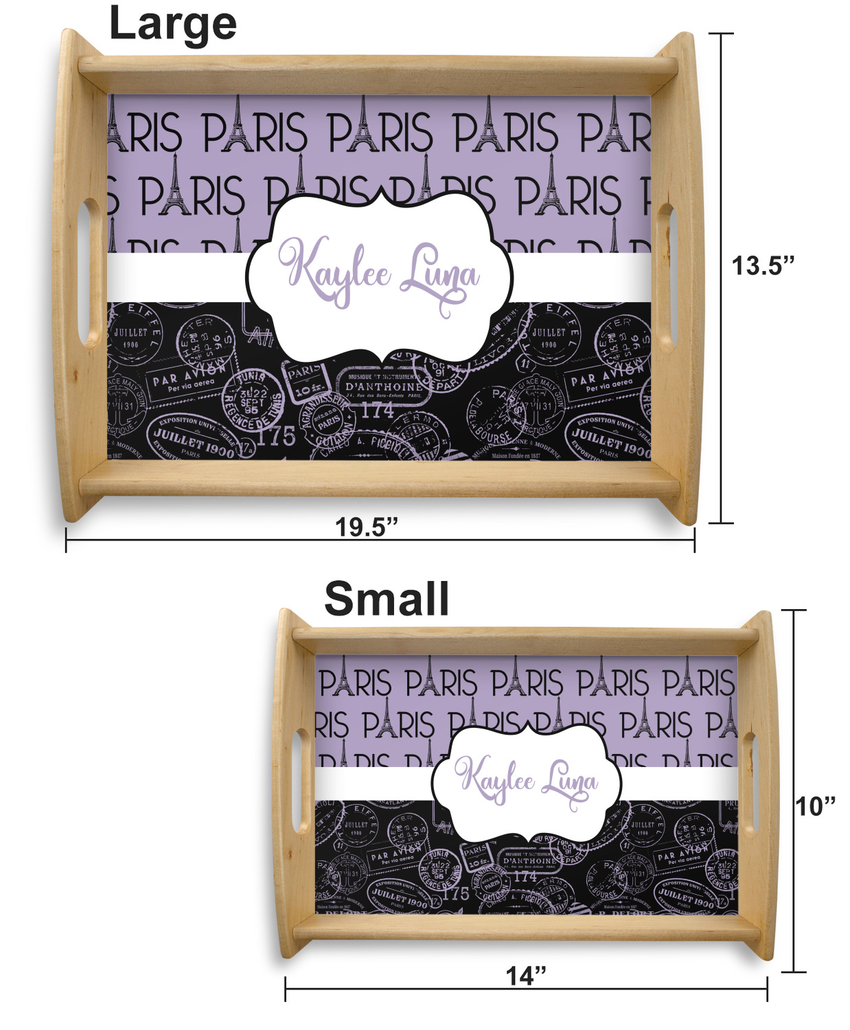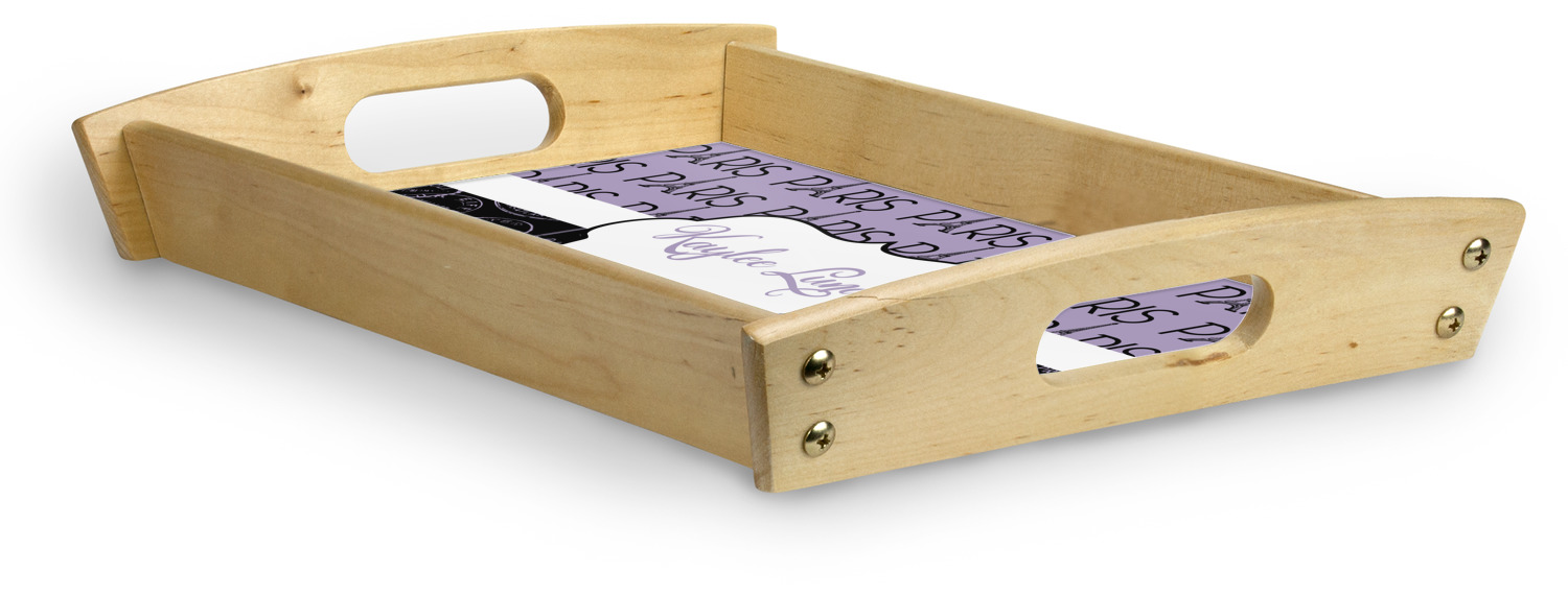This serving tray with handles features square edges and two rounded sides, creating a very modern look. Each side is fabricated from a beautifully cut, natural wood. The bottom of the interior of the tray displays your customized design in bright, vibrant color. The tray is sold in both a black color and a natural wood look. Each variation of the wood serving tray has two sizes: Small, which is 14" x 10" x 2.25", and Large, which is 19.5" x 13.5" x 2.75".
