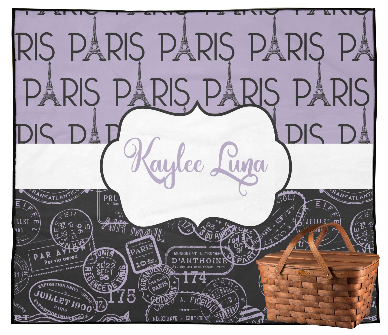 A gorgeous wide black and white polka dot band adds a touch of French whimsy. The beautiful white label highlights the personalization of your choice.