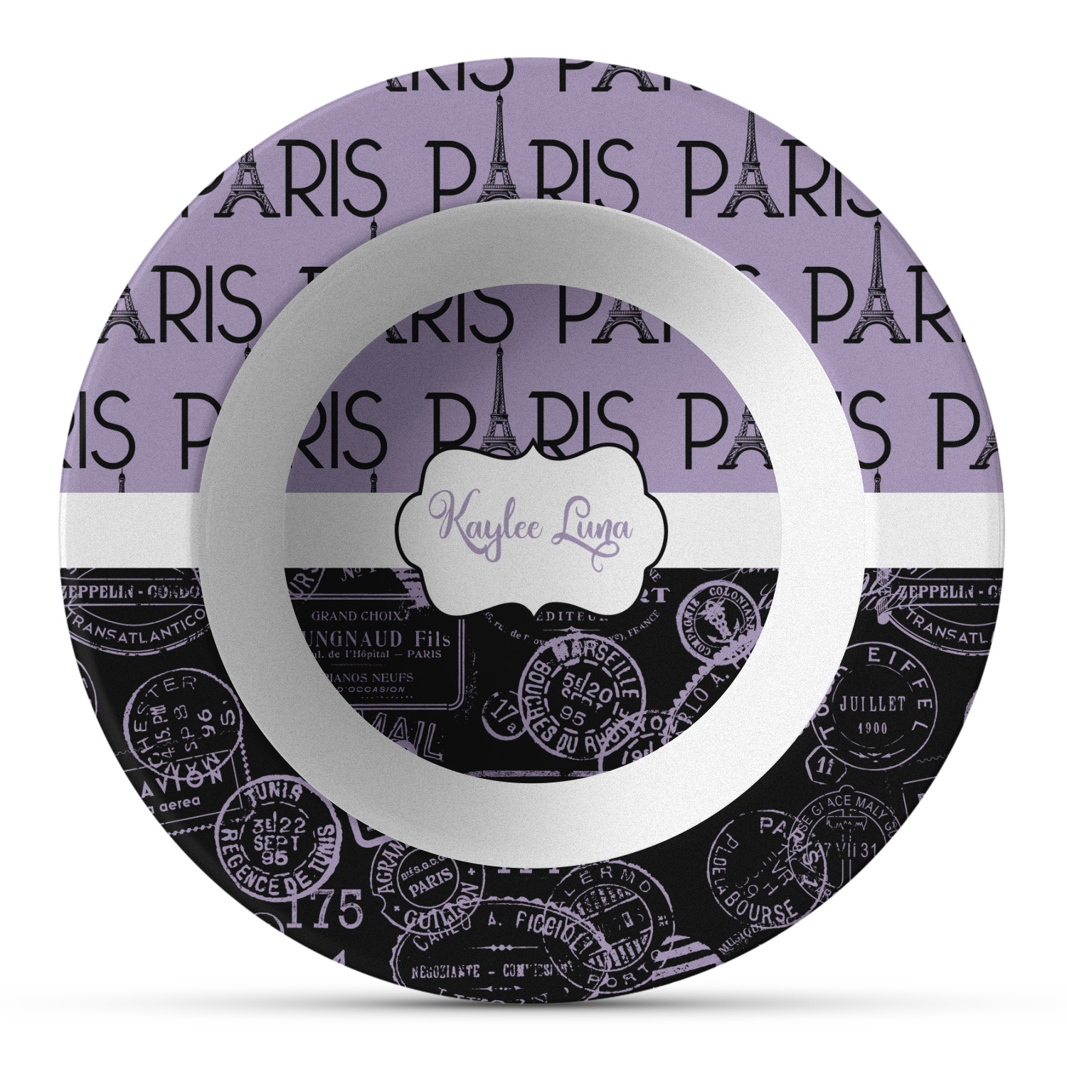 Made from a composite, thermo-set, polymer plastic, these dinner bowls have the versatility, durability, and weight of a melamine bowl without any of the downsides of melamine. Unlike melamine dinnerware, these bowls can withstand high heat. These custom plastic bowls can even handle temperatures of up to 250 degrees Fahrenheit, for up to 60 minutes. The pieces of our plastic dinner set are never made with harmful chemicals, such as BPAs, formaldehyde, DEHPs. We display your personalization on the base of this bowl's interior, while the bowl itself has an 8.75" diameter and is 1.75" tall.