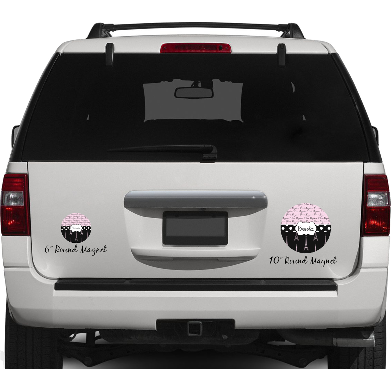 Your personalized car magnets are available for purchase in two shapes and two sizes. We carry round and square editions; each shape can either be 6 by 6 inches, or 10 by 10 inches, depending on your needs. Both versions are 1 millimeter thick, which is considered, within the industry, as the ideal thickness for automobile magnets. The magnetic car decals will adhere to any smooth, metal surface of your cars body, such as the trunk door or a side panel. However, please note that some vehicles are constructed from fiberglass bodies, which prevents the adhesion of anything magnetic. We advise that you test your vehicle before purchasing these magnets.