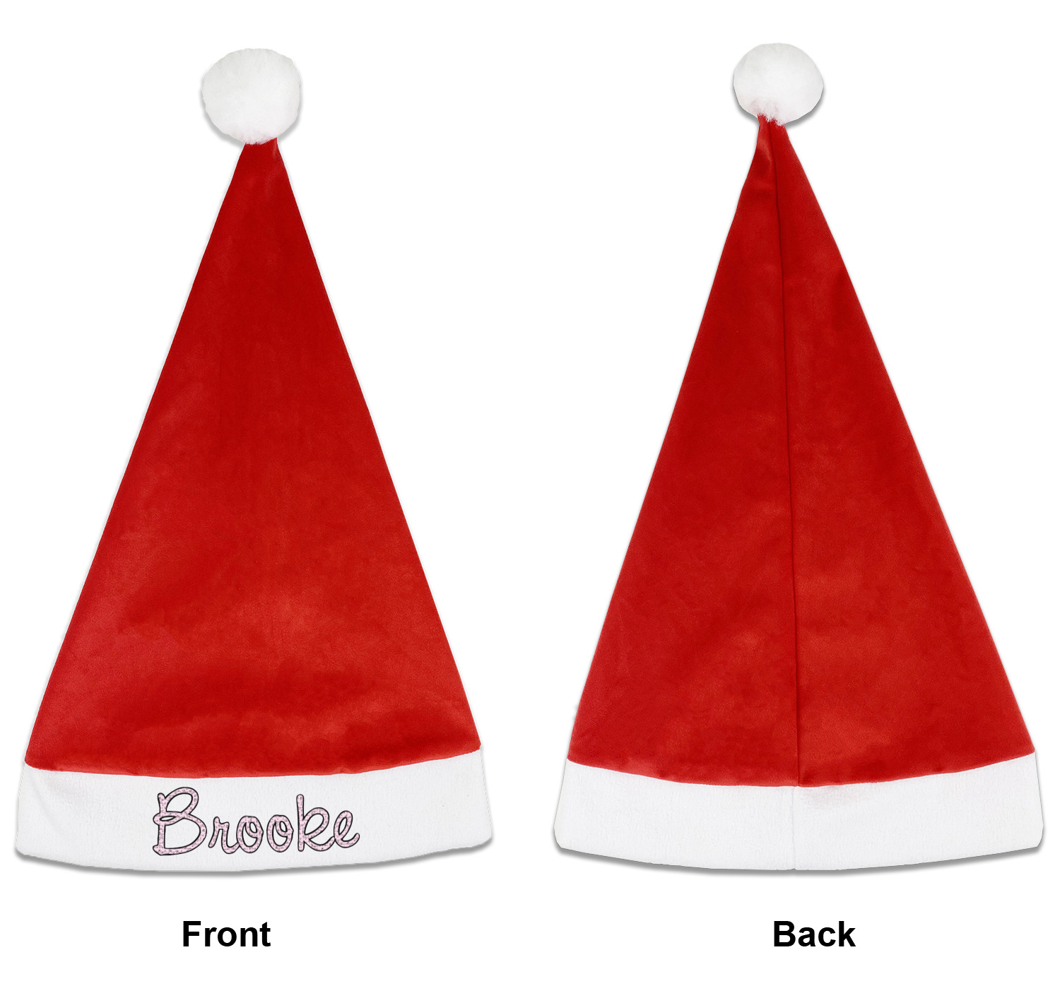 Our Santa hats are a soft, velvety polyester material. These customizable Santa hats are a classic red with white brimming and pom pom ball hanging off the hat tail just like Santa Claus! Each personalized Santa hat is approximately 17.5 L x 11.8 W. We offer two different styles to print your designs on the white brim - front or front & back.