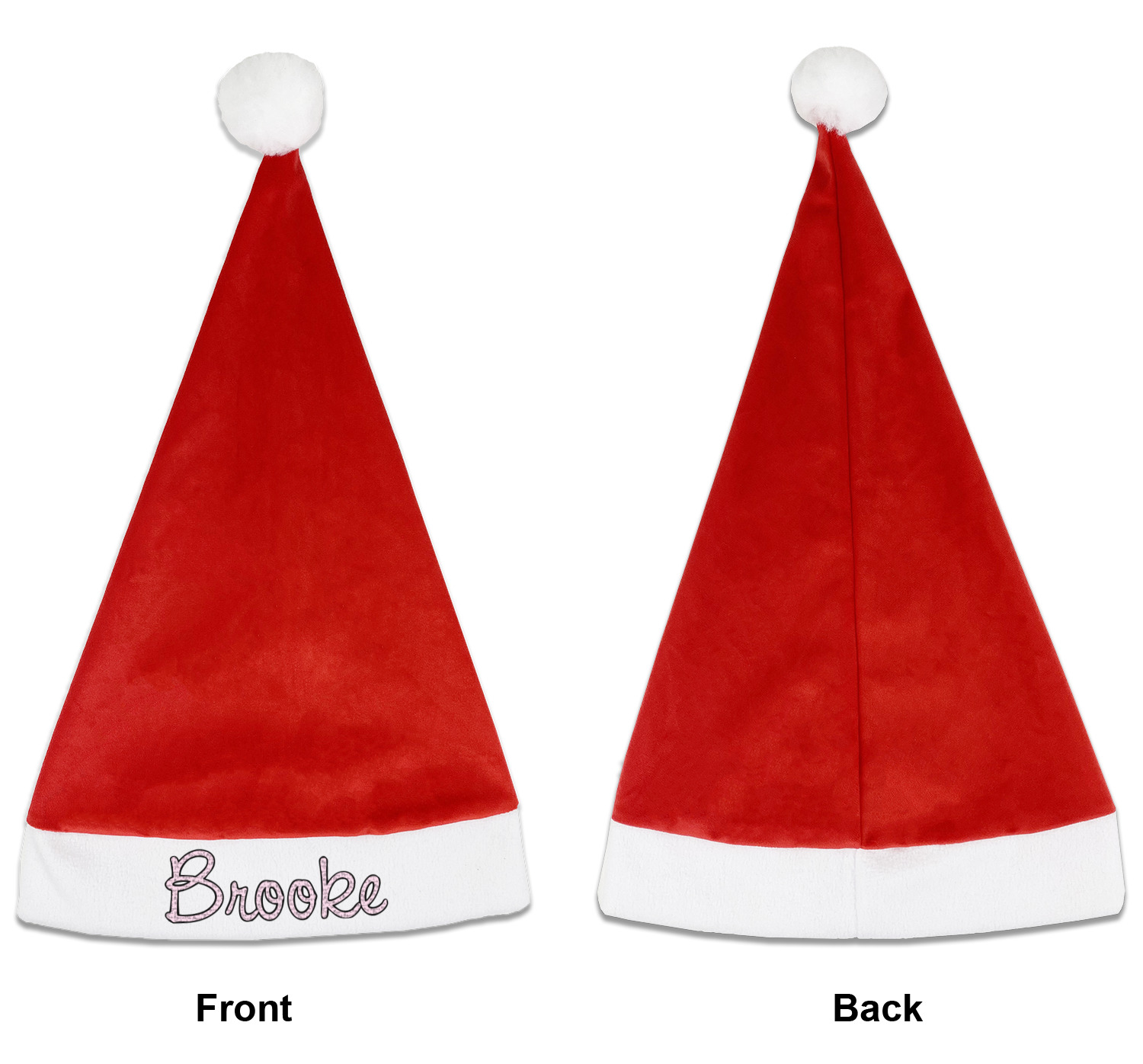 Our Santa hats are a soft, velvety polyester material. These customizable Santa hats are a classic red with white brimming and pom pom ball hanging off the hat tail just like Santa Claus! Each personalized Santa hat is approximately 17.5 L x 11.8 W. We offer two different styles to print your designs on the white brim - front or front & back.