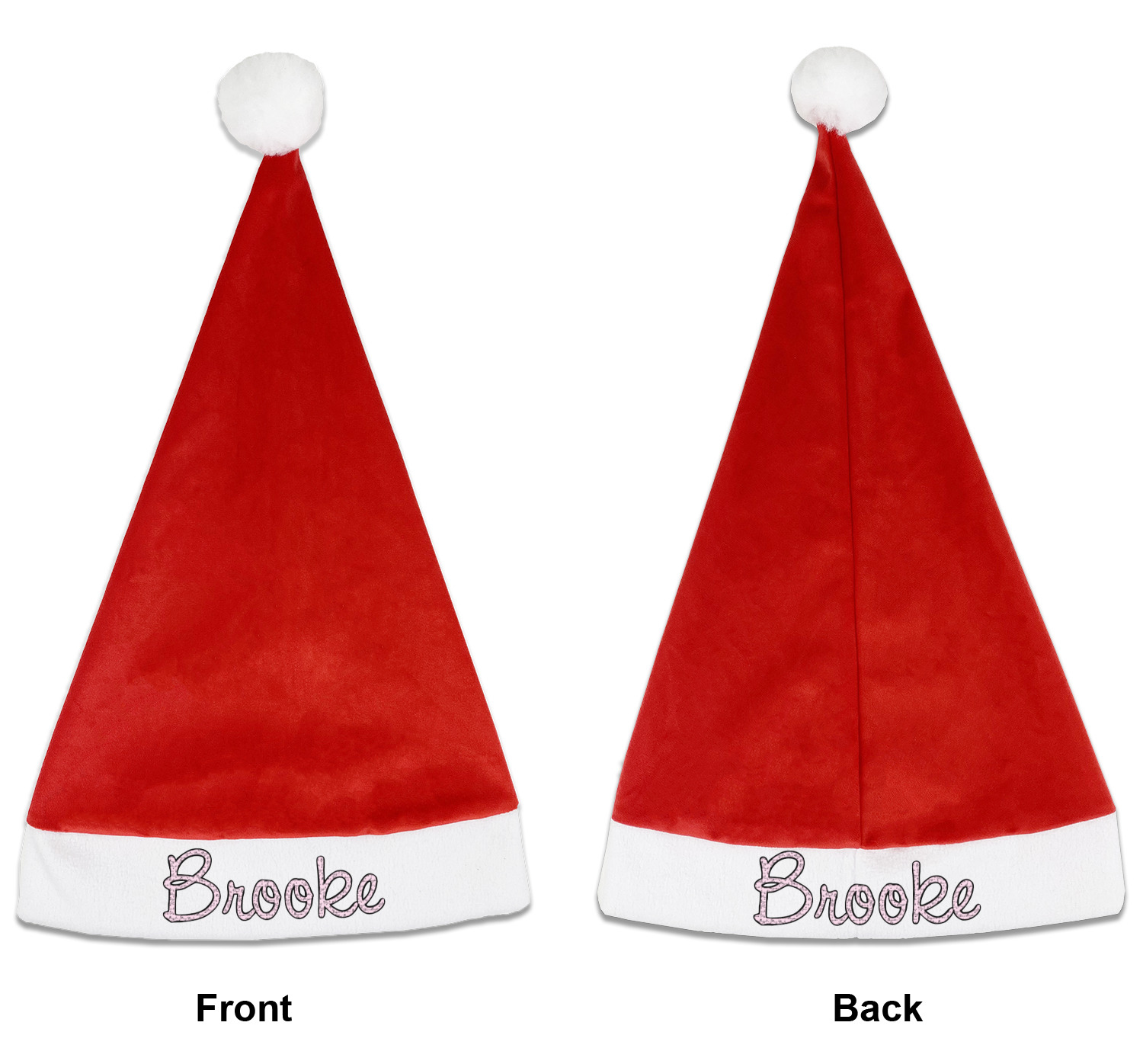 Our Santa hats are a soft, velvety polyester material. These customizable Santa hats are a classic red with white brimming and pom pom ball hanging off the hat tail just like Santa Claus! Each personalized Santa hat is approximately 17.5 L x 11.8 W. We offer two different styles to print your designs on the white brim - front or front & back.