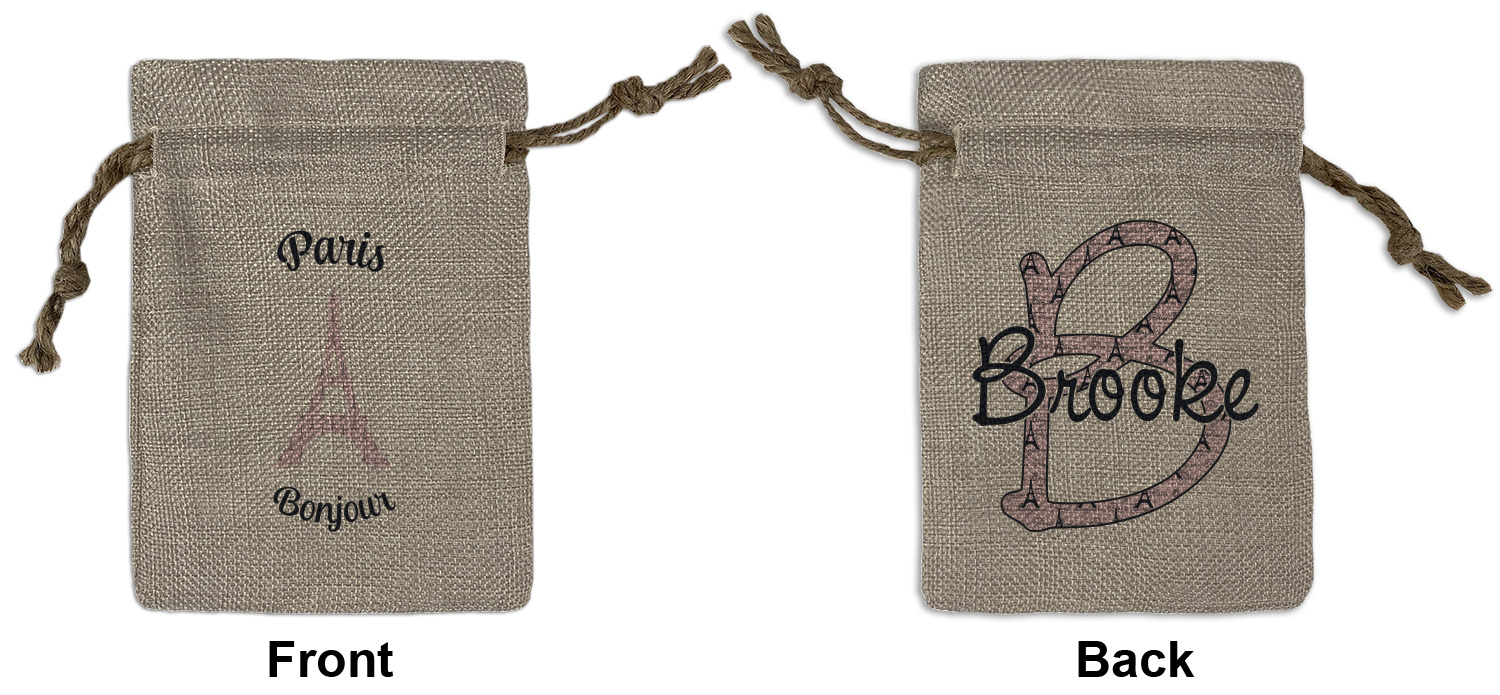 We sell our Burlap Gift Bags in 3 variant sized bags. Made with burlap polyester, each personalized bag can be secured with a twine drawstring pull. Your custom design is available to print on one side or both sides - completely up to you! The sizes of the bags measure approximately 4.5" x 6.5" for the smallest size, 6.5" x 8.0" for the medium size, and 6.5" x 13.5" for the large-sized bag.