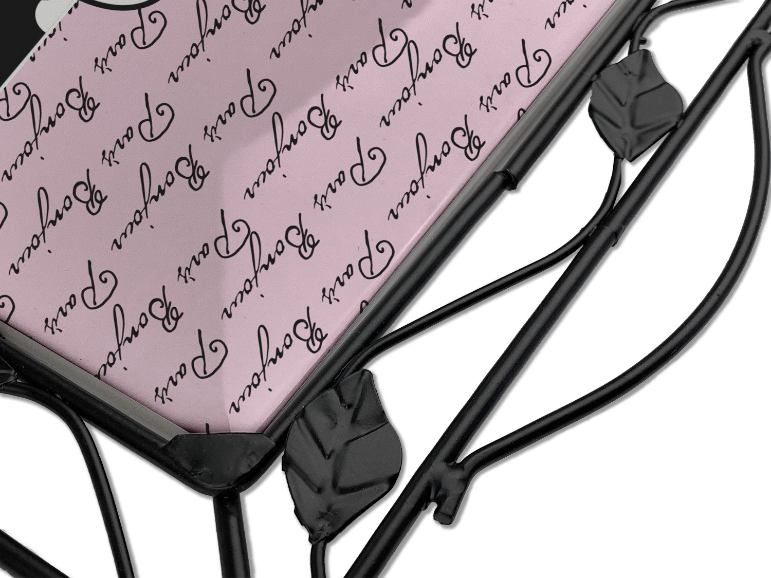 A gorgeous wide black and white polka dot band adds a touch of French whimsy. The beautiful white label highlights the personalization of your choice.