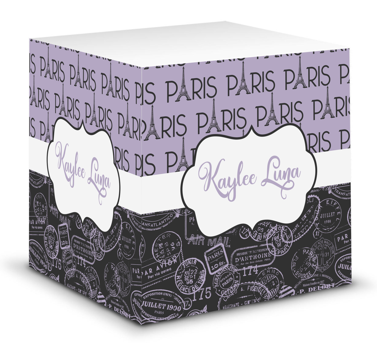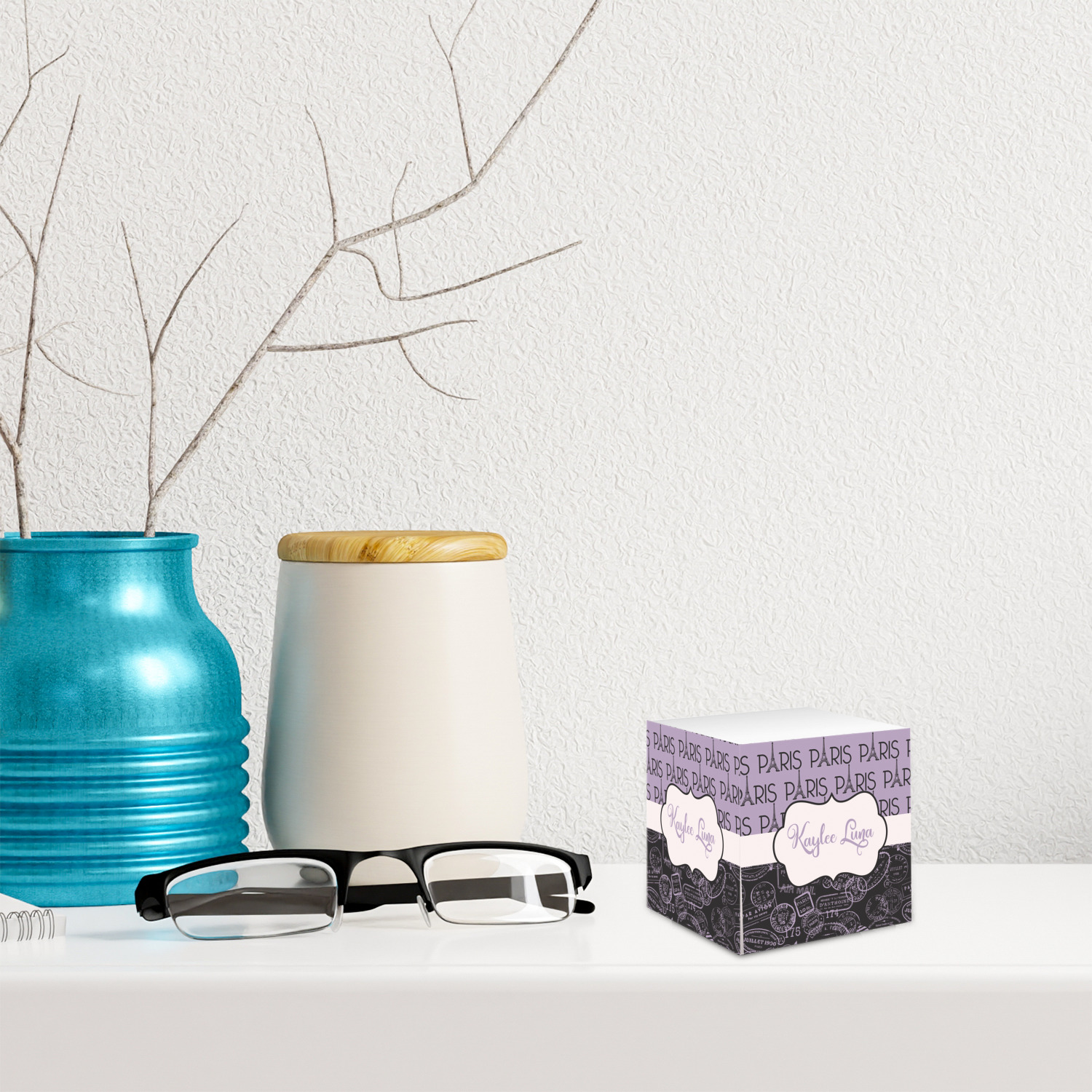 This note cube features 700 sheets of matte, white paper. Each sheet measures at 3.5 by 3.5 inches and has an adhesive strip at its top. Your personalized design is displayed on all four edges of the sticky pad.