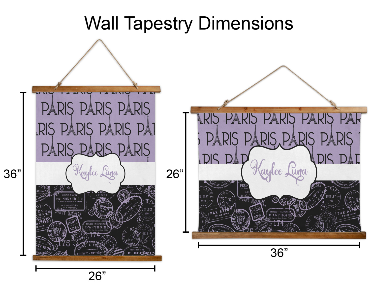 Made in two different orientations - portrait or landscape - both are 26" x 36". Your design is printed on a high quality polyester fabric with hemmed edges. The wood on the top and bottom of the tapestry is 1.25" tall and 0.25" thick and there are two pieces on top and bottom which sandwich the fabric.