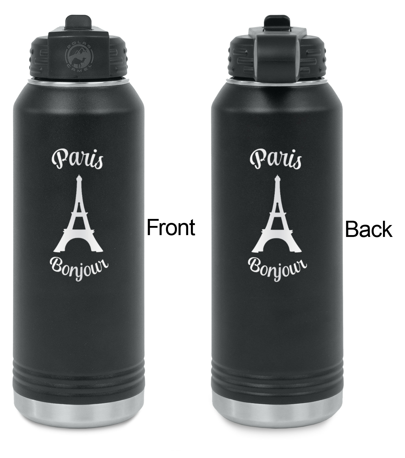 Your design is laser engraved on the water bottles. The engraving removes the black powder coating in the designed area to expose the silver stainless steel underneath.