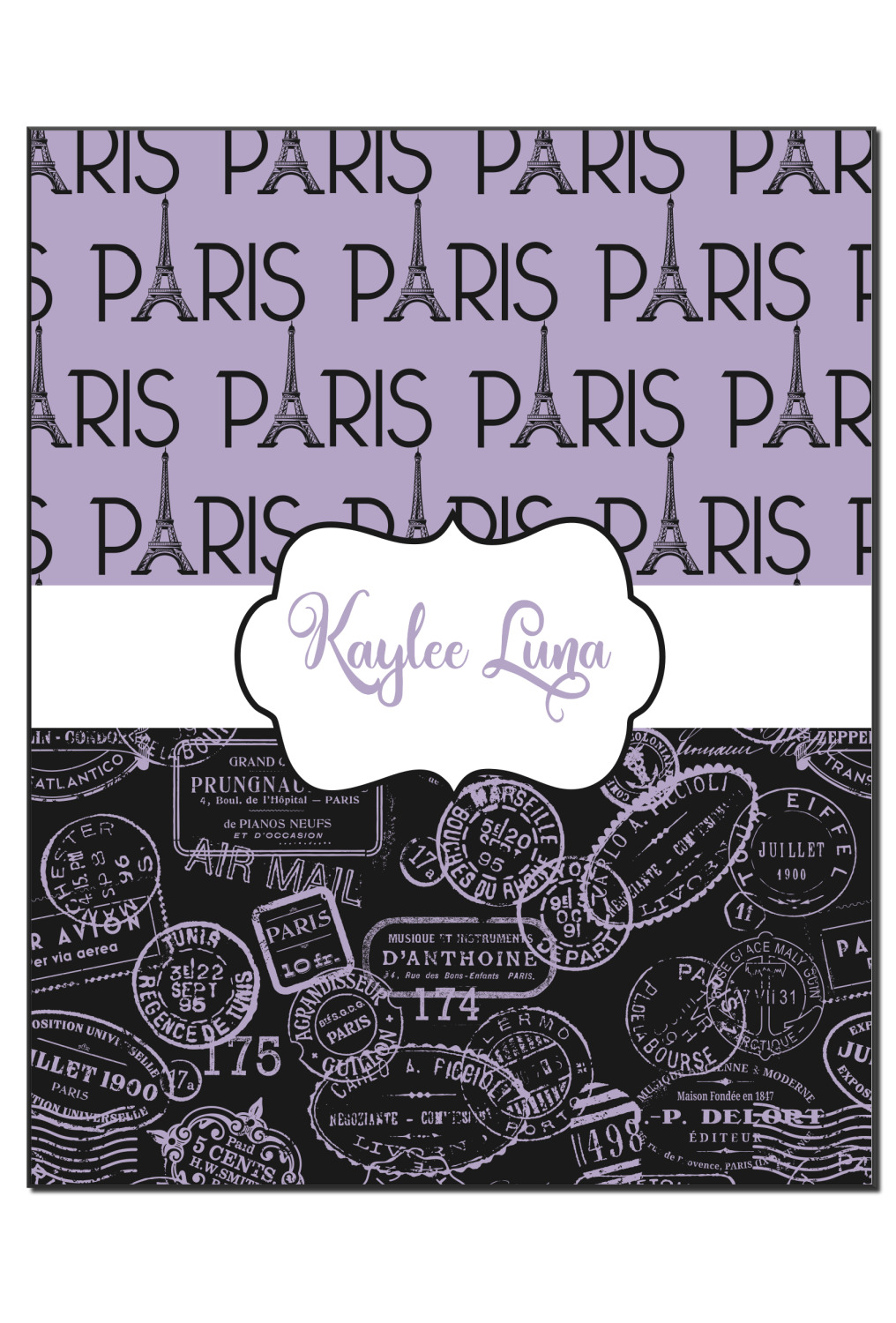 A gorgeous wide black and white polka dot band adds a touch of French whimsy. The beautiful white label highlights the personalization of your choice.